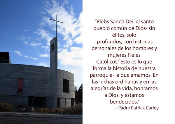 En el 2014 el padre Carley describió la parroquia como “Plebs Sancti Dei: el santo pueblo común de Dios- sin elites, solo profundos, con historias personales de los hombres y mujeres Fieles Católicos.” Esto es lo que forma la historia de nuestra parroquia- la que amamos. En las luchas ordinarias y en las alegrías de la vida, honramos a Dios, y estamos bendecidos.”