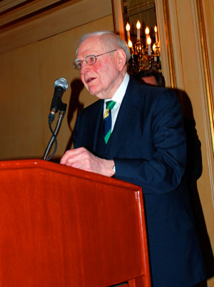 SALT LAKE CITY — There was Irish humor aplenty as more than 800 people gathered April 3 at Little America for the Christus Saint Joseph Villa Hope Benefit tribute to Jack Gallivan, the late Grace Mary Gallivan, and the entire Gallivan family. Prominent among the participants were almost all the Gallivans, the Most Reverend John Charles Wester, bishop of Salt Lake City, Church of Jesus Christ of Latter-day Saints President Thomas S. Monson and his wife Frances (just days before he would be sustained as the 16th president of the LDS Church), Elder M. Russell Ballard of the LDS Church and his wife, Barbara, event patrons the Philip McCarthey family, and Villa president and chief executive officer Galen Ewer and his wife, Carma. Master of Ceremonies Pamela Atkinson welcomed everyone to the event. Father Patrick Carley, pastor of St. Joseph the Worker Parish, gave the invocation before dinner. Reflecting on the Gospel story of the disciples on the road to Emmaus, Bishop Wester said the event gave participants the opportunity to journey together. Christus Saint Joseph Villa, he said, gives people the opportunity to hear the Word of God and break bread in a life affirming way. "The administrator, the staff, and all the Villa caregivers participate in the Easter story of new life. Now we can take the time to be with each other and break bread." Jack Gallivan is like an institution in this city, said Ewer, reminding participants that the ribbon had just been cut on Grace Mary Manor, 84 units of permanent housing for people in the area who are chronically homeless. Named after the late Grace Mary Ivers Gallivan, Grace Mary Manor honors the work done on behalf of the homeless by Jack Gallivan and his late wife. In a video presentation, friends and acquaintances spoke of Gallivan’s long history (60 years) with the Salt Lake Tribune, and his vision that allows him to see the big picture, the long-term impact any project will have on Salt Lake City and the state of Utah, with which Gallivan has had a long love affair. The video acknowledged Grace Mary’s devotion to Jack and the couple’s children. Having worked for the Salt Lake Tribune for 40 years, Deacon Lynn Johnson said Gallivan was more than a boss, "he was the patriarch, and he helped shape the destiny of the city and the state." Others spoke of Gallivan’s current philanthropic work, the Crusade for the Homeless, of which Grace Mary Manor is the second facility to be opened. Other members of the Gallivan family were credited with their support of Christus Saint Joseph Villa. Gallivan’s comments of gratitude were brief and gracious. "We are most grateful for the honor you pay us Gallivans tonight as we are more grateful for your generosity in support of Saint Joseph Villa. Saint Joseph’s is a great, good neighbor institution of the state, made great by its dedicated, inspired staff. To them and you we offer this lovely old Irish blessing: May there always be a light/in your eyes and your window./ May there always be time/ for a cup of tea with your neighbor./May there always be a child/ and an old person in your life each day./ May you always know the joy of giving to others./ And when you go to confession/ may you always get a priest who is hard of hearing. Amen. After those words, auctioneers Atkinson and Terry Wood from KTVX Channel 4 took over, encouraging generous bids on 10 donated items.