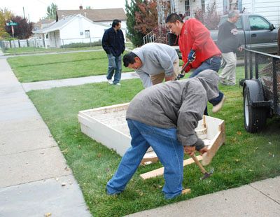 MIDVALE — A little rain and cold weather didn’t deter men, women, and children from throwing their time and energy into helping renovate the St. Therese of the Child Jesus Parish food bank. The only parish-based neighborhood food bank in the Salt Lake Valley, St. Therese Parish volunteers were joined by members of the Knights of Columbus (K of C), and Rotary Club members from Taylorsville and Midvale. The goal was to renovate the food bank over several weekends while closing the facility down completely as few days as possible. "This is a big job," said St. Therese Pastor Father Martin Diaz. "But it needs to be done. This year the parish decided we would help the poor before we help ourselves, so some parish projects will wait." As a neighborhood food bank, the St. Therese facility gets regular shipments of food, diapers, and personal items from the Salt Lake Food Bank, which they distribute to their 40-80 clients. "We don’t have any location or income restrictions," Fr. Diaz said. "We ask that people come to us only once a month. That way we can be certain we’ll have enough for everyone." In addition to reflooring the house-sized food bank, the parish will add seven refrigerators through generous donations from the Rotary Club of Midvale and the Church of Jesus Christ of Latter-day Saints Humanitarian Services. The project, which includes renovating the parish’s second-hand clothing bank, is organized and led by Joe Ortiz, a grand knight of the parish K of C chapter. "Our knights and parishioners, both Hispanic and Anglo have been very supportive of this project," said Fr. Diaz. "They all have been very generous with time, talent, and treasure to make this renovation a reality." For more than 15 years the parish clothing bank was organized by Edilia Romero. At her retirement, it has been taken over by Guadalupe Huerta. "Renovating the food bank will make it easier to move to a client-choice system rather then people picking up pre-bagged groceries and supplies they may not want," Fr. Diaz said. The crew began working on the project Oct. 19, preparing the old floor to be covered, cleaning, and moving large items to the yard. When additional volunteers arrived the next day, the sub-flooring began, and hundreds of trips were made from the house to a borrowed Utah Food Bank trailer. "This project is long overdue," said parishioner Teri Mueller. "The floor is in bad shape, and the house gets very crowded. We hope the renovations will give us better organization and more room." See more on this project in future issues of the Intermountain Catholic.