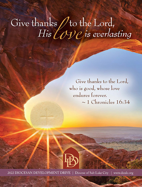 SALT LAKE CITY — The 2022 Diocesan Development Drive, the bishop’s annual appeal to provide operating funds for diocesan ministries, kicks off this month. The annual drive helps support more than 30 diocesan ministries such the formation of priests and deacons, the work of the Office of Marriage & Family and the Respect for Life Commission. All funds raised are used to support diocesan ministries, programs and services. “Give thanks to the Lord; his love is everlasting,” this year’s theme, from 1 Chronicles 16:34, was chosen by Bishop Oscar A. Solis.