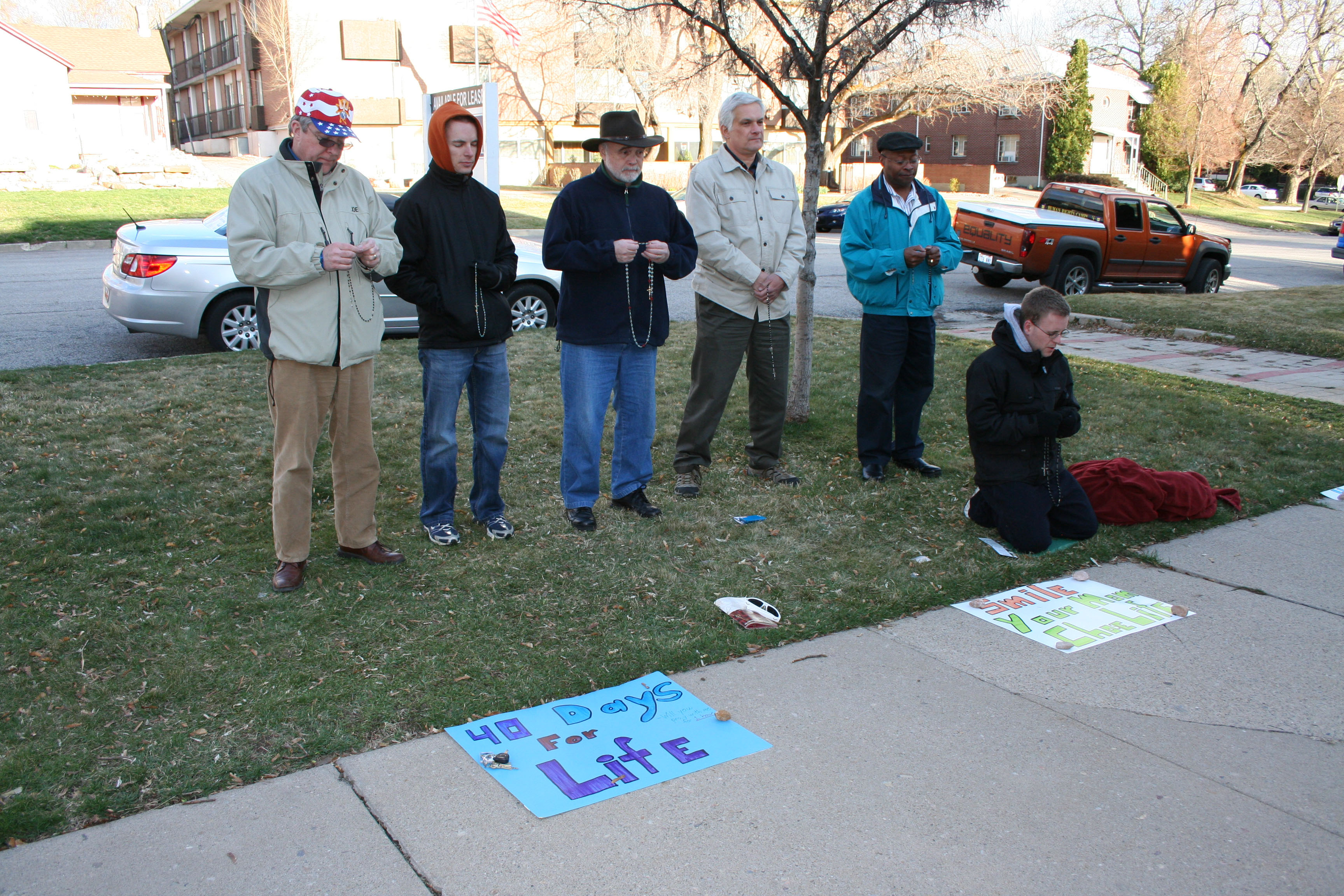 Knights and other members of the church gather to pray the rosary in front of the Planned Parenthood clinic as part of the 40 days of Lent.