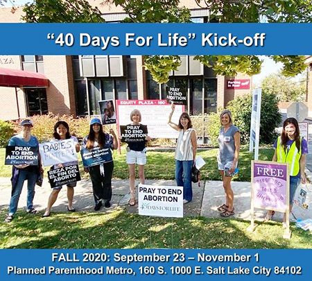 El 23 de septiembre marcó el inicio de la campaña de 40 Días por la Vida, durante el cual un grupo de feligreses de la Iglesia Católica de St. Thomas More se unió para rezar en las afueras de la clínica Planned Parenthood en Salt Lake City. Miembros del ministerio de Respeto por la Vida de St. Thomas se han comprometido a que todos los miércoles de 10 a.m al medio día rezar en la clínica hasta que la campaña concluya el 1 de noviembre. Para registrarse en la campaña acuda a: 40DaysForLife.com/SaltLakeCity.