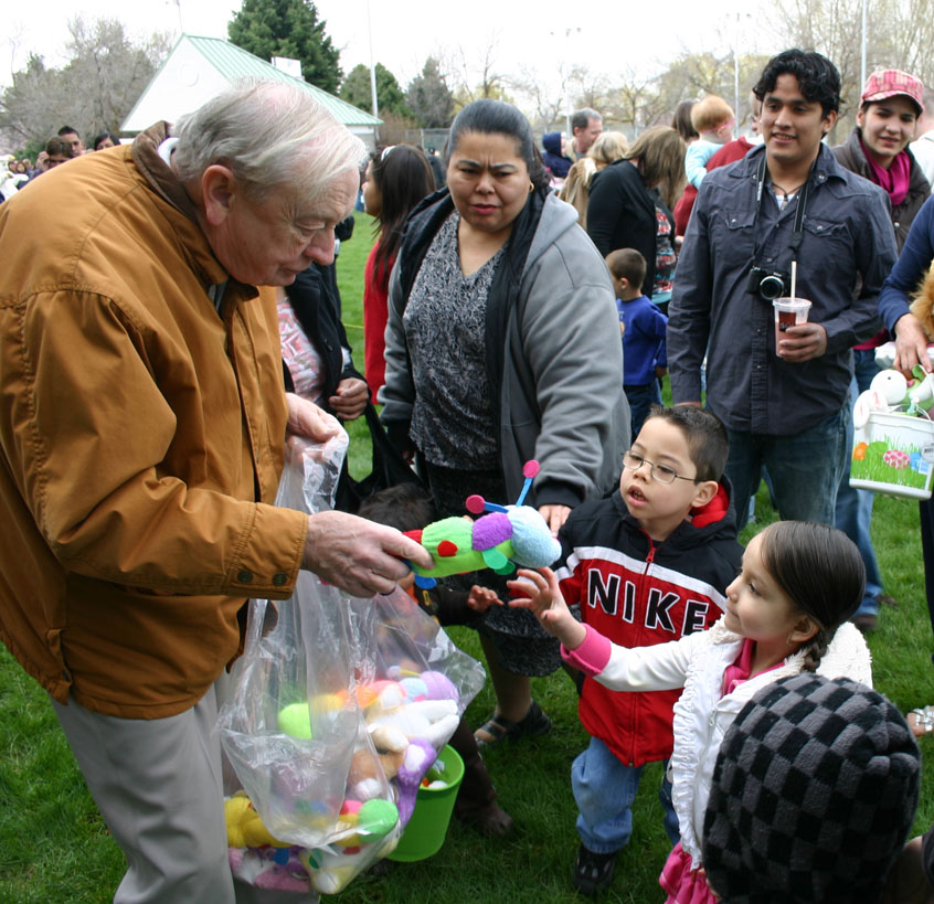The Knights of Columbus Council 6010 of Saint Rose of Lima Parish in Layton held its annual Easter Egg hunt April 23. The hunt started at 10 a.m. with five age groups. Gathering prizes, chocolate and plastic eggs from Saint Rose parishioners started months ago; the parishioners came through with 7,500 eggs for the event. The Easter Bunny showed up about 30 minutes before the hunt to pass out candy and take pictures with all of the children. When the whistle blew, more than 700 children flooded Layton Park to look for eggs. If they were lucky and found one of the grand prize eggs (four per age group) they received a giant stuffed animal. After the children collected the eggs, Monsignor Victor Bonnell (shown), Saint Rose pastor, and Deacons Willis Bassett and John Weis passed out stuffed animals to the little children, to ensure everyone walked away happy. Courtesy photo/Marty McMerrick