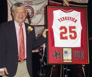 SALT LAKE CITY — "You call him things like coach, dad, colleague, and teacher," said Jim Hamburge, principal of Judge Memorial Catholic High School. "He is the reason I came to Judge, and the reason I have ‘we’ on all of my clothes." The Judge team motto is, "The best potential of me is we." The Judge Memorial Catholic High School community, family, and friends honored Vice Principal Jim Yerkovich for his 40 years of coaching boys basketball March 11, at the Downtown Marriott Hotel. The evening was filled with love, laughter, and praise for Yerkovich, who was named Coach of the Year in 1985. Yerkovich and his 2006 basketball team were congratulated for defeating Tooele High School 40-29 to become the 3A State Champions Feb. 25 at Weber State University. Their winning formula was defense, which brought them a record of 24 wins and one loss. Hamburge thanked everyone for coming to honor such a special man, and announced after the new field is built, they will build the Yerkovich Athletic Center. Hamburge said in 1991 he took a plane to Washington for the first Congress for Secondary Catholic Education. He was the representative from Minnesota and Yerkovich was the representative from Utah. He had a nine-hour delay, and when he walked into the congress, the only chair left was next to Yerkovich. "That was one of the luckiest days of my life," said Hamburge. "From that point on, we became friends. I came to Utah on Yerkovich’s claim that Judge is just so incredibly special. He was right, and he is one of the reasons why." Coach Y, as he is affectionately known, was honored to have 350 guests attend the dinner of which, more than 80 were former Judge players, four were coaches who coached against Yerkovich’s teams, and five were the starting players from the 1960 Judge team on which Yerkovich played. Judge Memorial Assistant Coach Marty Giovacchini (1973), gave the history of players from 1966 to 2006, and their accomplishments. Yerkovich’s first State Championship Title was in 1980. Giovacchini reiterated the fact there would have been more championship trophies if it were not for some highly questionable officiating. The Bulldogs lost the final championship games in 1970, 1973, 1985, 1989, and 2003. "All the players found it a true pleasure playing for Coach Yerkovich, and everyone is a major part of this program," said Giovacchini. "In all the years I played for Coach Yerkovich or helped him, I have never heard him belittle or berate a player. He has always treated every player as a valuable human being with the dignity and respect they deserve, while still being able to make a point." Giovacchini said at the beginning of this year, Yerkovich was not sure if he was going to be able to coach as a result of recent bypass surgery, a problem with his hand, and a knee replacement, and they came out and won the state tournament. Now Yerkovich thinks he may be able to coach another four or five years. Judge Memorial Athletic Director and Assistant Coach Dan Del Porto (1985), credits Yerkovich for the professional direction he took in his life, and says he owes him a lot personally. Del Porto said Coach Y’s record speaks for itself. He has had 552 wins, 12 regional championships, five state runner-ups, two state championships, 17 appearances in the Final Four, and 11 invitations to the Alhambra Catholic Invitational Tournament (ACIT) Tournament. "When Coach Y first started, he just wanted to be able to scrimmage and stay close to teams such as Highland and Olympus High Schools," said Del Porto. "Now we will play DeMatha High School in the ACIT Tournament March 16. They are the fourth-ranked high school team in the country." Long-time friend, former Judge teammate (1961), and former Judge assistant coach for 20 years Phil Purcell said he and Yerkovich became best friends when Yerkovich started going to Judge in his sophomore year after moving from Rock Springs, Wyo. He said Yerkovich was a great shooter, and led the state in scoring. Purcell recalled one day in high school asking Yerkovich what he was going to do when he grew up. "Yerkovich answered, ‘I am going to play college basketball, major in math, and when I am done, I am going to go back to Judge Memorial and I am going to teach math and coach basketball,’" said Purcell. "That is what the man has done, and he did it in a way that makes all of us who know him unbelievably proud. "The loyalty he has shown to the boys he has coached, the school he coached for, his own children, his family, his friends, and most importantly his beliefs, which he has shared with many of us," said Purcell. Neil Yerkovich, Coach Yerkovich’s brother, played on the first basketball team Yerkovich coached for Judge in 1966 through 1969. Coach Yerkovich said his brother has been his biggest fan across the miles, and has shared all that has happened with Judge basketball including the championship, along with all the former Judge players. Former teammates, players and opposing coaches remember Yerkovich for his sportsmanship, his circle of love and friendship, insight for his players, a lot of good laughs, teaching them values, enhancing the growth of the players both educationally and athletically, and credit him for 37 of them becoming teachers and coaches. Yerkovich’s two daughters Noel Ladner (1985) and Mary Chris Ledbetter (1988) said they are proud to say Coach Yerkovich is their dad. They had the unique privilege of being born into the Judge community. Ledbetter said after basically living and breathing Judge for her entire young life, she never thought she would return as a guidance counselor and basketball coach. What she appreciates most about her father is that even though he could have critiqued her every move in basketball, he told her he would only help if she asked. When he did give her coaching advice, it was always positive. Yerkovich received a standing ovation as he came to the stage. "Needless to say, I am overwhelmed," said Ye