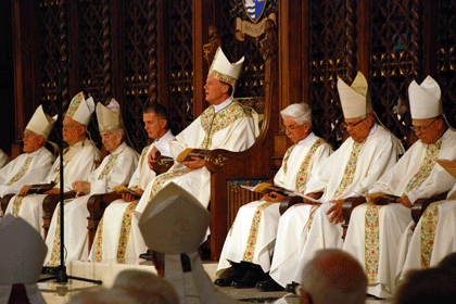 SALT LAKE CITY — "Our gathering here today unifies two themes set before us by the liturgy," said His Eminence William Joseph Cardinal Levada, Prefect of the Congregation for the Doctrine of the Faith from Rome. "The first is the glorious Assumption of the Blessed Virgin into heaven, and the second is the anniversary of this cathedral, which took place 100 years ago today," said Cardinal Levada at the Solemn Mass of the Assumption in the Cathedral of the Madeleine Aug. 15. The Mass was concelebrated by The Most Rev. John C. Wester of the Diocese of Salt Lake City, Cardinal Levada, the visiting archbishops, bishops, and priests. Cardinal Levada and the Most Rev. John C. Wester, Bishop of the Diocese of Salt Lake City, were joined at the altar and adjoining pews by bishops and archbishops from throughout the West and Guatemala. Bishop Wester’s predecessors The Most Rev. William K. Weigand, Bishop Emeritus of Sacramento and The Most Rev. George H. Niederauer, Archbishop of San Francisco, also joined him on the altar. "At the heart of the celebration of the mysteries of faith is the death and resurrection of Christ, the Paschal Mystery," said Cardinal Levada in his homily. Cardinal Levada said the power of Christ’s death and resurrection is presented in the dramatic image in the reading taken from the book of Revelation. As a woman with a crown of 12 stars around her head is about to give birth, a dragon with seven heads and 10 horns waits to devour her child. But the child is coughed up to God and to his throne – a reference to the Paschal Mystery of the cross, resurrection, and ascension of our Lord. "This passage is an Easter narrative," said Cardinal Levada. In the reflection on this biblical passage, the Church began to recognize early on the doctrine we know today as the Assumption of Mary into heaven." Cardinal Levada compares the Assumption of the Blessed Virgin Mary and the Cathedral of the Madeleine’s role in the life of Utah’s Catholics. Both are part of God’s plan, which begins with the death and resurrection of Jesus Christ. "That second part of God’s plan is unfolding in our midst even today as we celebrate 100 years of this great cathedral," said Cardinal Levada. Cardinal Levada said the Virgin Mother of God was taken up into heaven to be the beginning and pattern of the Church in its perfection as a sign of hope for us on our pilgrim way. "At the dedication 100 years ago today, as proclaimed by Pope Paul VI at the Second Vatican Council, and here today at this Cathedral of the Madeleine, Mary showed herself as Mother of the Church," said Cardinal Levada. "In celebrating this anniversary of the dedication of the cathedral, we are calling to mind the great work of sanctification, which has occurred in and through this cathedral church. Like every church, it is a model of holiness for those who come to pray and worship in it. It is a model of what we are and of what we are to become. "At the heart of this cathedral is the altar. Likewise our hearts must become altars on which God is praised," said Cardinal Levada. "As Christ dwells in the tabernacle of this cathedral, he must dwell in the tabernacle of our souls. This cathedral prefigures the glory that all of creation will have at the end of time. In its extraordinary beauty, it is nothing less than a sign of the beauty of the new and heavenly Jerusalem." Cardinal Levada said Bishop Lawrence Scanlan, the first bishop of the Diocese of Salt Lake City, is buried behind the altar of the Cathedral of the Madeleine. Bishop Scanlan was responsible for the building of the cathedral, and dedicated it 100 years ago today. "We thank Bishop Scanlan for his foresight and dedication," said Cardinal Levada. "We also pray in a special way for Bishop Wester, who today is the ninth diocesan bishop of Salt Lake City." Bishop Wester said Cardinal Levada’s presence "honors us greatly." Bishop Wester was ordained bishop by then Archbishop Levada in 1998, and worked as an auxiliary bishop to Archbishop Levada before he was called to Rome. Archbishop Levada replaced Cardinal Joseph Ratzinger after he was elected pope Benedict XVI by his fellow cardinals. Bishop Wester was installed in the Diocese of Salt Lake City March 14, 2007.
