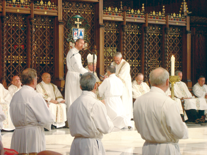 SALT LAKE CITY — The Most Rev. John C. Wester, bishop of the Diocese of Salt Lake City performed the institution of acolytes during Mass at the Cathedral of the Madeleine Feb. 21. Bishop Wester called the 21 men to be instituted into the ministry of acolyte and gave each a vessel with the bread to be consecrated. "Take this vessel with bread for the celebration of the Eucharist. Make your life worthy of your service at the table of the Lord and of his Church," he said to each while they responded "Amen." Bishop Wester said we live in a society that praises individual achievement. We take pride in doing things without anyone’s help. We buy self-help books. "But today we celebrate service at and for the altar," he said. Being an acolyte requires conformity to the Church with a "generous, humble, and obedient response." It entails a strong and close relationship with the community, where a call is formed and nourished; and a relationship with Christ that is expressed in daily prayer and devotion. This devotion to serve is manifested with the simple and beautiful act of kissing the altar. "We are ordained – others baptized – for the service at the altar, which is a sign of our love of Christ," said Bishop Wester. He also reminded the acolytes "You are always sent forth to live what you’ve celebrated." Bishop Wester acknowledged the important role the acolytes’ wives play. They support their husbands through prayer and sacrifice; and add wisdom, strength, and courage to their ministry so whatever they do, they do it under the name of Jesus, said the bishop. The newly instituted acolytes are candidates to be ordained deacons early next year. Once they are ordained deacons, they will have the ministry to preach the Gospel. Additionally, they will have the authority to celebrate baptisms and marriages, serve communion, and perform dominical celebrations in the absence of a priest. They cannot, however, consecrate the wine and bread, hear confessions, or give anointing of the sick, among other things. The Mass was also a celebration of the 16th anniversary of the rededication of the Cathedral of the Madeleine.