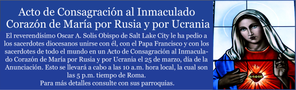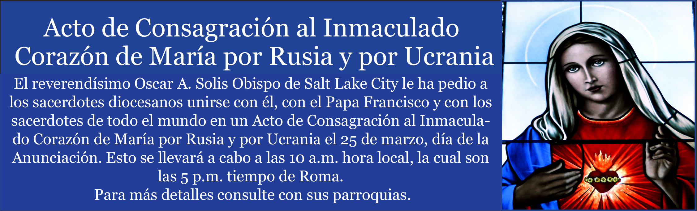 El reverendísimo Oscar A. Solis Obispo de Salt Lake City le ha pedio a los sacerdotes diocesanos unirse con él, con el Papa Francisco y con los sacerdotes de todo el mundo en un Acto de Consagración al Inmaculado Corazón de María por Rusia y por Ucrania el 25 de marzo, día de la Anunciación. Esto se llevará a cabo, si es posible, a las 10 a.m. hora local, la cual son las 5 p.m. tiempo de Roma. Para más detalles consulte con sus parroquias.