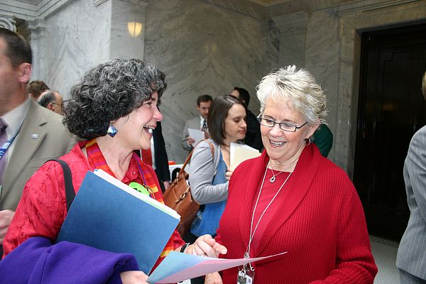 Rebecca Raybould (left) discusses two bills with State Representative Carol Spackman-Moss during Advocacy Day on Feb. 21 at the Capitol. Raybould, a member of Coalition of Religious Communities – A multi-faith response to poverty, said the coalition is for HB – 125 Access to Dental Health, which creates a pilot program for individuals on Medicaid to receive basic dental care. The coalition is against SJR 22 – Joint Resolution on State Spending, which seeks to amend the Utah Constitution to limit the amount that the state budget would increase from year to year.