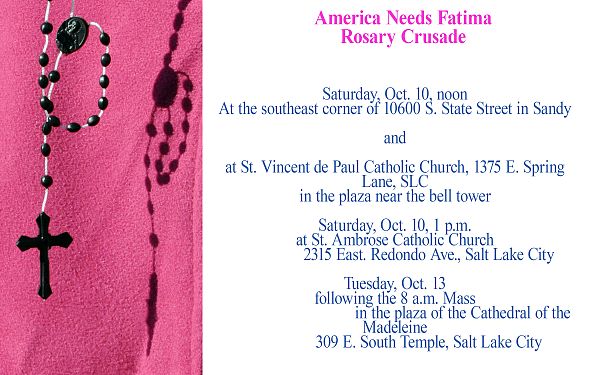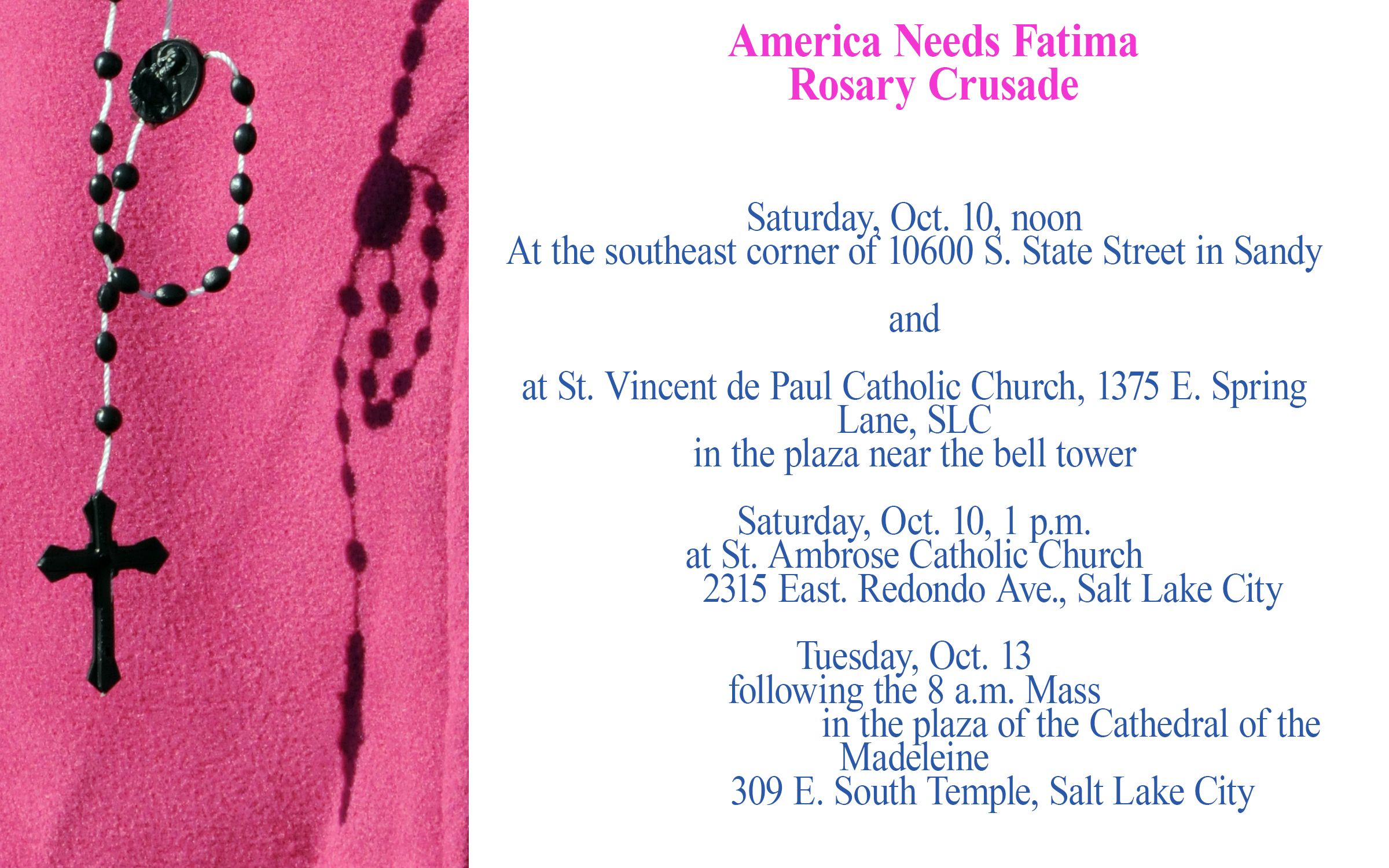 SALT LAKE CITY – Three local America Needs Fatima Public Square Rosary Crusade rallies are scheduled this year to bring the message of our Lady of Fatima to Utah and the world.