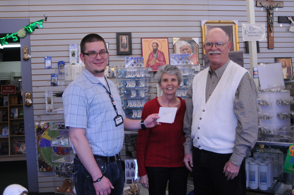 Erwin and Alice Weil (right) were the winners of the drawing that was held for those who returned the hard copy version of the Intermountain Catholic readership survey. The Weils, members of Saint James the Just Parish in Ogden, won a $100 gift certificate from Mancuso’s Religious Goods Gifts-Books, Inc. They are shown receiving the gift certificate from Justin John, of Mancuso’s.