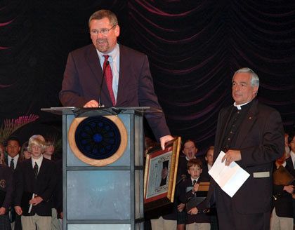 SALT LAKE CITY — Fluid conversation and a spirit of celebration moved among the nearly 450 people who attended the third annual Bishop’s Dinner at the Grand America Hotel Sept. 26. Although the Diocese of Salt Lake City still lacks a bishop, an episcopal presence in the form of retired Bishop Richard Hanifen of Colorado Springs was not to be missed. The focus of the evening was on the complexus of the physical Cathedral of the Madeleine and all the people who have made it a part of the community. "Truly, I think the cathedral and all those who go to great lengths to put on the amazing series of liturgical and cultural events speak for themselves," said Laurel Dokos-Griffith, development director for the cathedral, in a recap of the fund raiser. Although exact figures for the money raised are not yet available, Dokos-Griffith believes this year’s Bishop’s Dinner will be the most effective of all. "I do not feel that the absence of a Bishop was a big factor, although in the early stages I thought it would be," said Dokos-Griffith. "However, if my instinct is correct, this will be the biggest of the three years." Even though the Bishop’s Dinner is a fund raiser specifically for the Cathedral of the Madeleine, it is also a gathering moment for people throughout the community. Before the meal, the choristers of the Madeleine Choir School were introduced by musician Craig Jessop, music director of the Mormon Tabernacle Choir. The Episcopal Diocese of Utah was also visibly present at the dinner, and a photograph of St. Mark’s Cathedral was featured in an advertisement in the program. In his remarks, cathedral rector Fr. Joseph Mayo asked if anyone could picture Salt Lake City without "the Magnificent Lady on South Temple, Mary Magdalene Cathedral." Although few of the stately houses which once lined South Temple still grace that broad avenue, the Cathedral of the Madeleine has remained a center of attention. The story of the cathedral gargoyles presented in a video gave added depth to the story of the cathedral and the changing impressions of the people of Salt Lake City. A copy of that video will be available on the Intermountain Catholic website http://www.iCatholic.org attached to this story. Before the evening was over, Fr. Mayo introduced the Intermountain Catholic’s new book, "Pilgrimage: a journey through the Holy Land with the words of Archbishop George Niederauer," which was presented as a gift to everyone who attended. To donate to the Bishop’s Dinner, contact the Cathedral of the Madeleine at (801) 328-8941.
