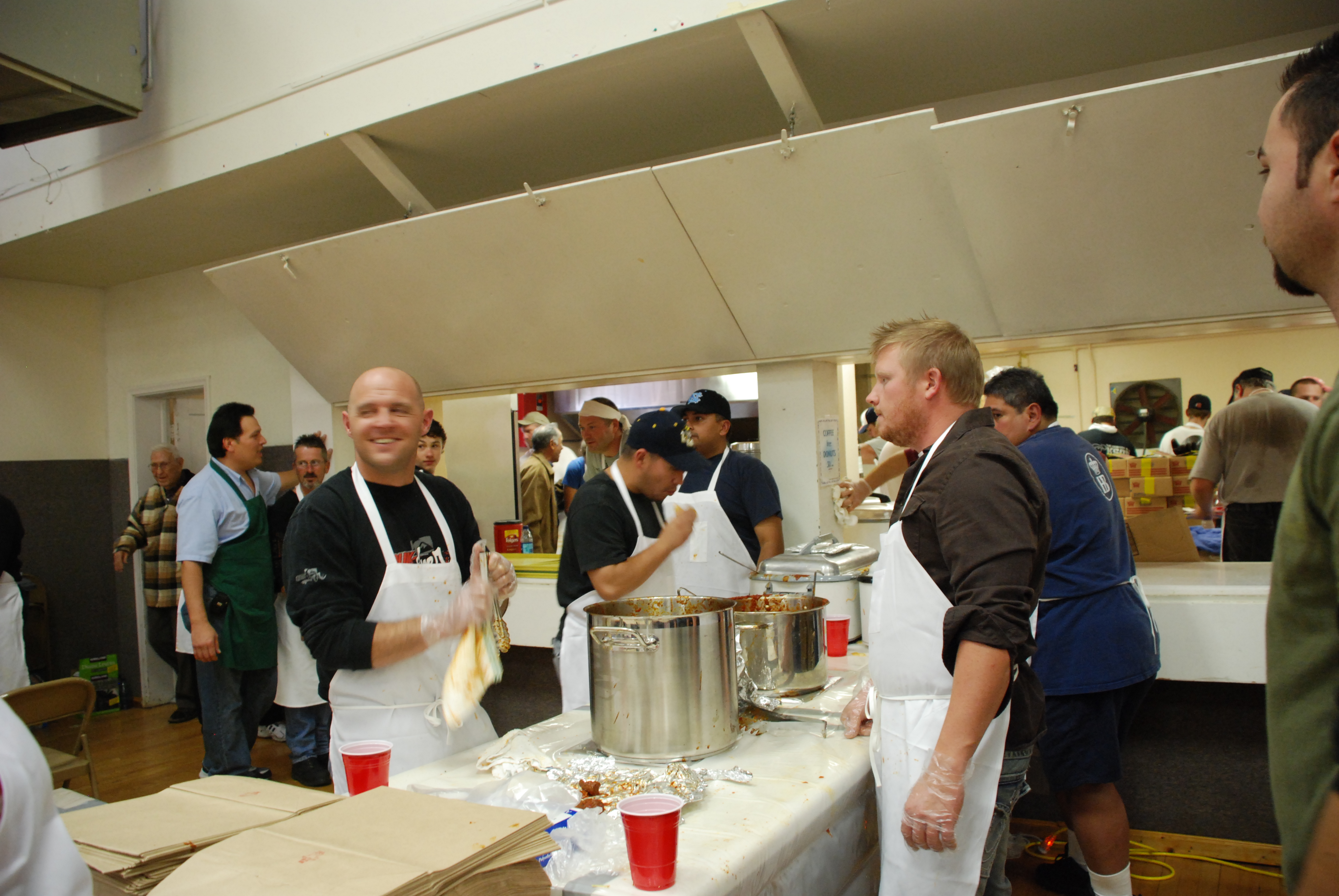 The men on Meatball Row take a moment's rest before the next rush starts. The largest fund raiser for Our Lady of Lourdes Parish is an all-you-can-eat affair with dinners served in the dining room or prepared for take-out. Snow didn't dampen the spirits.