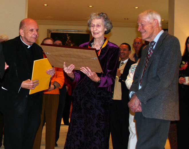 SALT LAKE CITY — "I speak on behalf of all of us in the Diocese of Salt Lake City, when I say how very grateful we are, Bernice to you and to Msgr. Fitzgerald for this third edition of "Salt of the Earth," said the Most Rev. John C. Wester, Bishop of the Diocese of Salt Lake City at the Pastoral Center Christmas luncheon Dec. 12 at the bishop's residence. Bernice Maher Mooney and Vicar General Msgr. J. Terrence Fitzgerald collaborated so closely on this project, they decided they would coauthor this third edition. "It is a tremendous legacy to our diocese to have in writing this very wonderful publication, and history of our diocese and our local church. It is of the Holy Spirit at work in the Church through so many people. And, of course, all of us are beneficiaries of those who have gone before us. It is our prayer that we will leave a legacy for those who will come after us. "Bernice, you and Msgr. Fitzgerald have given us this rich gift, and there is no way we can ever repay you," said Bishop Wester as he presented Bernice with the highest award a lay person can receive. Bernice received from Pope Benedict XVI, the Equestrian Order of Saint Gregory the Great for Women Award. "You certainly deserve this award for your great work, your dedication to the Church, and for the gift your have given the Church for generations to come. I want you to hear in my humble words, echoes of gratitude from generation to generation. You will always be somebody in our local Church who is very special. Congratulations, and may God always bless you." Bishop Wester said we would have had an award for Msgr. Fitzgerald, but he has already received every award you can have. "He has received the Notary Apostolic, which could actually make him more important than me if I were important," said Bishop Wester jokingly. "My personal gratitude for Msgr. Fitzgerald is not only for what he does, but for being such a dear friend," said Bishop Wester. "I was installed March 14, 2007, and he has been a constant support day-in and day-out. Also, on a professional level, he is so tireless in his service to the church and in his service to me. I am very grateful for that. I want to thank Msgr. Fitzgerald for his collaboration with Bernice on this very important work. "I have been a priest for 46 years since 1962," said Msgr. Fitzgerald. "During that time I personally experienced nearly half of the history since the dedication of the Cathedral of the Madeleine (in 1909). I grew up in Utah, so as a young boy going through Catholic school and the parishes, I knew a lot of the people in ‘Salt of the Earth.' I knew many of the priests, religious women, and lay people. So as a result, I was able to add the perspective of my experience of them into the story of the book. Because I was here and lived so many of the events, I was able to reflect back on the historic significance of those events as they related in history. "Working with Bernice was a privilege," said Msgr. Fitzgerald. "She is extremely knowledgeable as a researcher and is extremely knowledgeable in terms of journalistic and editorial requirements that go into publishing a book. We were really responding to the University of Utah Press when we worked on the book because the director of the University Press, approached us and asked if we would publish the book because the University wants to reflect the diversity of Utah's culture in their various publications. They felt it would be good to have Salt of the Earth as one of their publications. We were certainly inspired by that. The University Press provided a financial backing for the publication of the third edition of the book. " "Bringing this work up-to-date, up to the beginning of 2008, and Bishop Wester's presence in the Diocese of Salt Lake City, was really a wonderful opportunity for us to archive and document the marvelous things that have happened to our church as we are growing here in the state of Utah." "The previous two editions were published by the diocese," said Bernice who was the archivist for the Diocese of Salt Lake City for 18 years. In 1979, after living in California for 25 years and upon finishing my Master's Degree, we returned to Utah. My first book was "The Story of the Cathedral of the Madeleine," which I wrote in 1981. Having done that, I thought we could write a book using Msgr. Jerome Stoffel's research, much of which we used for the first edition of "Salt of the Earth." That was how it all began. The full title of the third edition is "Salt of the Earth – The History of the Catholic Church in Utah, 1776-2007," and it begins when Catholicism first entered into the State of Utah," said Bernice. "We wrote the third edition working with the second edition, with the intention of making it more of a narrative with less schedules and tables. When Msgr. Fitzgerald entered into the writing of the book as the coauthor, he brought a great deal of extensive information and experience he had with the dioceses," said Bernice. "He was able to enrich a great deal that was already in the manuscript, and add additional material and insight or a few additional words from his memory. It was difficult at times, and he was the guiding light that pulled us through." Bernice said the book required careful research when working with specific dates. The longest chapter discusses the 15 parishes Bishop Duane G. Hunt (1937-1960) founded. The book mentions all 49 parishes. "We not only had the planning, forming the notes, and the appendix, but we also completed the index, which is usually done by the publisher," said Bernice. "The third edition follows the same method that it had in the second edition, but the highlight of the book is the very exquisite pictures," said Bernice. "There is a group of color pictures that begin on page 171, that are very unusual. There are also black and white photos throughout the entire manuscript." Bernice said one of the most interesting items Msgr. Fitzgerald added to the b