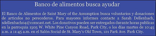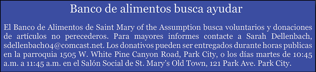 Las donaciones de artículos no perecederos siempre son bienvenidas; estas pueden ser llevadas durante las Misas en la parroquia Católica de St. Mary of the Assumption, 1505 W. White Pine Canyon Road, Park City, o los martes de 10:45 a.m. a 11:45 a.m. en el salón social de St. Mary’s Old Town, 121 Park Ave. Park City.