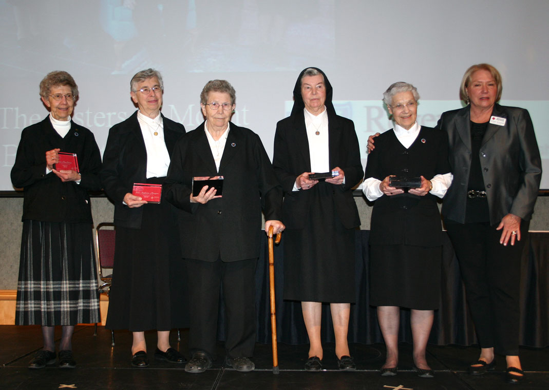 OGDEN — The six Sisters of Mount Benedict Monastery were honored with a standing ovation as they received the Lifetime Award at the American Red Cross Heroes Breakfast April 20 at the Eccles Conference Center. Among the others honored at the breakfast were people who pulled victims from burning homes and an overturned vehicle, and two soldiers serving in Afghanistan who risked their lives to save 24 troops and five civilians in contact with the enemy. The sisters received an award for having served the Ogden community since 1944. The first sisters to arrive in Ogden were Benedictine Sisters Ortrude Nester and Electa Thompson. "The sisters embody the Red Cross fundamental principal of voluntary service," said Robert Maxwell, emcee and ABC4 evening news anchor. "The sisters also are bright, compassionate individuals whose service and dedication has touched literally thousands of lives every year for a lifetime." "They came to this community in the 1940s as pioneers of St. Benedict’s Hospital and they have been selflessly serving this community ever since," said Mark Adams, CEO of Ogden Regional Medical Center. "I really believe the sisters represent the legacy of health care at Ogden Regional Medical Center." When St. Benedict’s Hospital was sold in 1994, the sisters went on to serve the needs of women and children through Saint Benedict’s Foundation, which was formed in 1976. "The foundation has a passion to serve the needs of women and children in our community," said Yvonne Coiner, foundation executive director. "It was the sisters’ decision, after the sale of the hospital, to stay in Ogden and to make this their home because they felt the need to serve women and children in our community." Adams said there is a set of values at the hospital of compassion, kindness, integrity, respect and loyalty, and the sisters embody those values in what they do. The sisters live by the motto and rule of St. Benedict that stresses prayer and work. "These are very important to each one of us as well as our community and Benedictines throughout the world," said Benedictine Sister Danile Knight, the monastery spokesperson. "So we spend part of our day working, in the hospital or in the monastery, and we spend three times a day praying together for peace in the world, the Church, the city of Ogden, and for all the people we interact with everyday." "It’s not just us being honored today," said Sr. Danile, "it’s those 300 sisters that came before us. We’re standing on some very great women’s shoulders. We are just continuing what they began." "It’s a very humbling experience," said Sister Luke Hoshette as she was greeted by a man who thanked the sisters for the care he received while he was in the hospital. "The mission of the sisters and the contributions to our community is outstanding," said Jeanne Hall, who served on the St. Benedict’s Foundation Board for six years. "We are Latter-day Saints, but we love working together on projects," added her husband, Alan Hall. The Halls are both members of the Heroes Selection Committee.