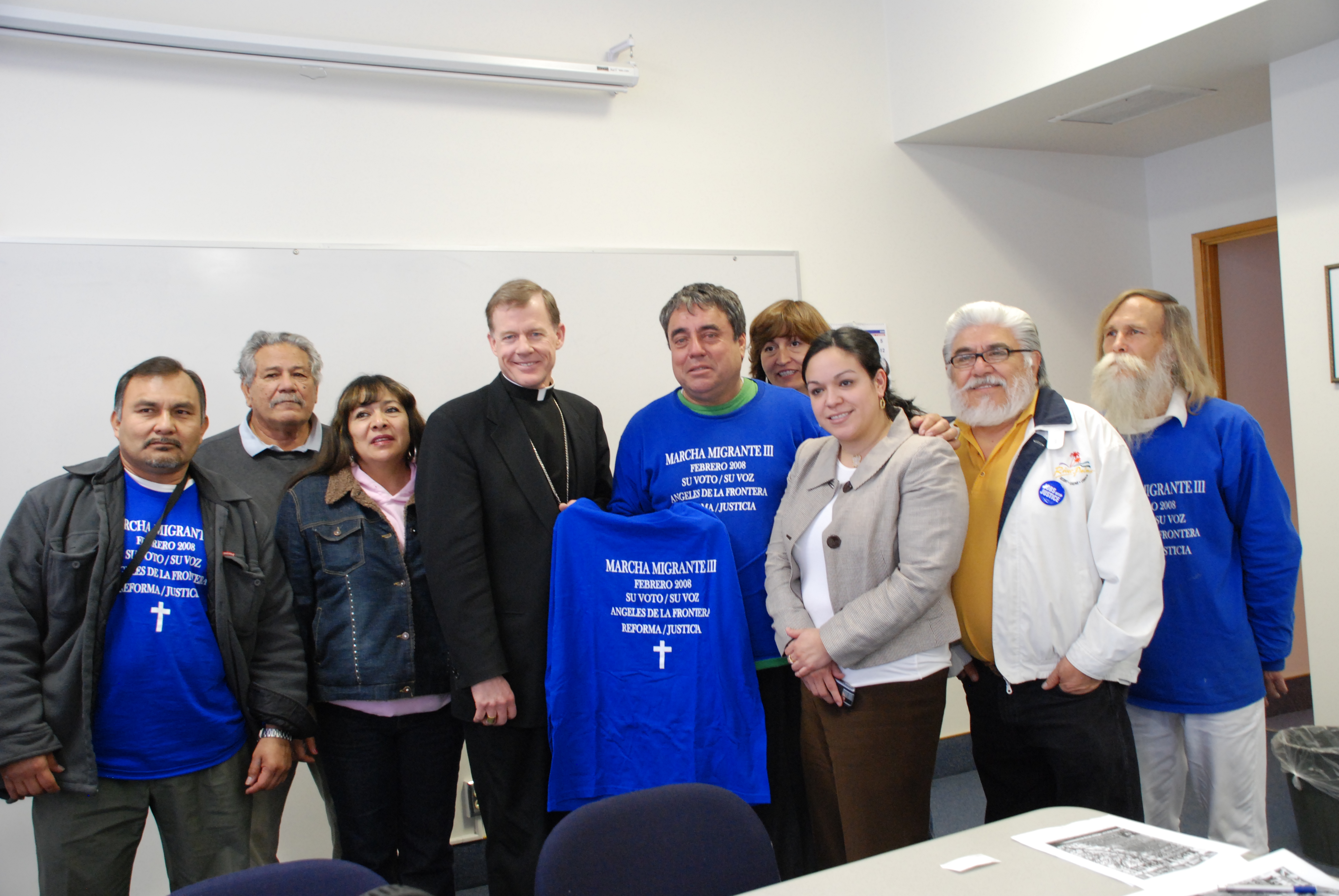 Bishop John C. Wester is paid a visit Feb. 15 by members of the Border Angels. On a caravan trip through states that are rarely visited by cross-country marchers and caravans of advocates, the Border Angels were on their way from San Diego to Washington hoping to heighten the awareness of people to the peril faced by immigrants crossing the border through the desert. Founded by long-time human rights activist Enrique Morones (on the bishop's left), the Border Angels set water and blankets out in the desert for the use of immigrants crossing the border. "We are a faith-based, all volunteer organization," Morones said. "If we don't help these people, they will continue to die in their effort to find a better life for themselves and their families." Morones estimates from two to three people die every day since the Department of Homeland Security has begun building a wall along the Mexican-U.S. border. "We hope to bring to Washington the stories we hear about the people making the dangerous trip through the desert," Morones said. He started Border Angels in 1968, and is the founder and first director of Mexico's Border Commission, an advisory group to Mexican President Vicente Fox and part of Mexico's Institute of Mexicans Abroad. The Border Angels have been featured on all major television networks as they continue their advocacy on behalf of immigrants.