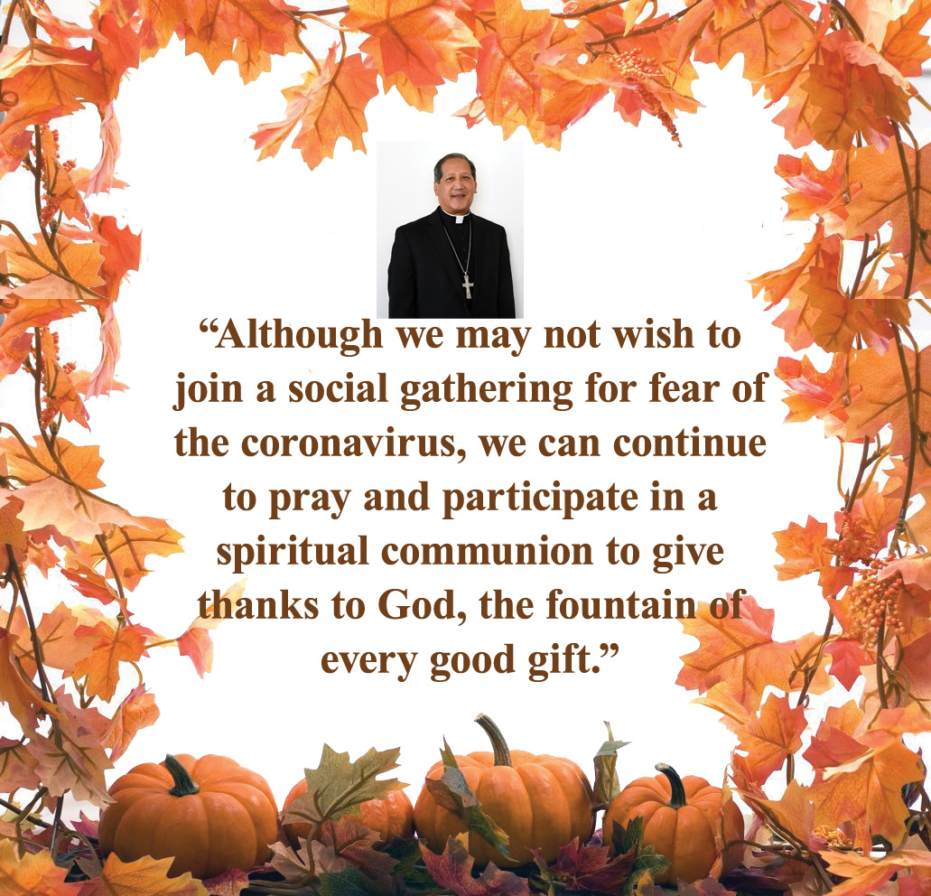 Today, aside from the pandemic, our country also has lamentable civil strife and wounds caused by political discord, social and racial inequity and religious differences. Thanksgiving will be a wonderful time to pray to God to heal these wounds, and to care for those who do not fully share in the blessings we have received. Let us not forget the unborn, the elderly, the sick, the migrants, the refugees and those in prison, as well as our brethren who lack housing, food and health care, and to commend to God the souls of the faithful departed.