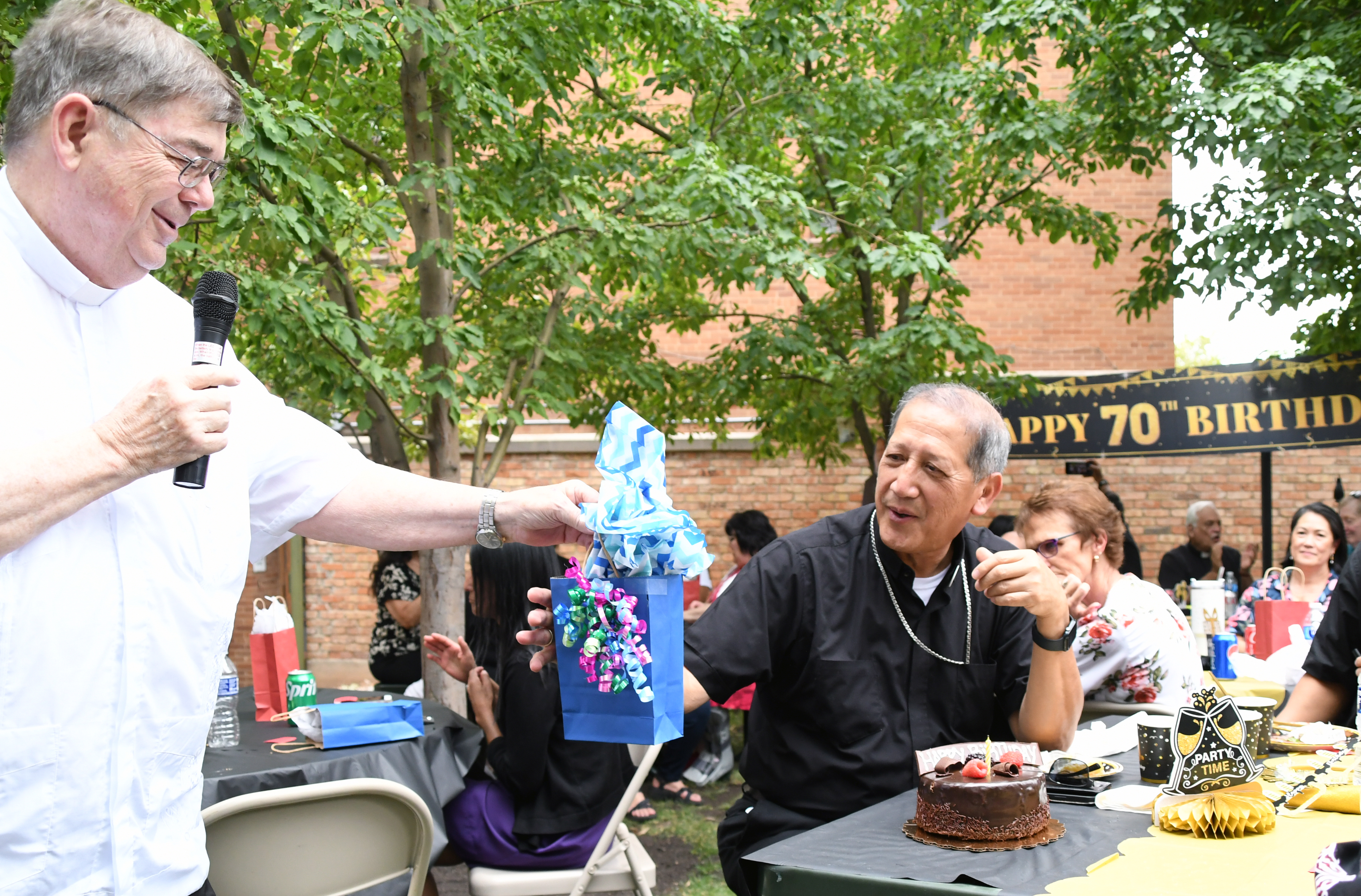 The annual diocesan staff barbecue on Aug. 18 was an occasion for an early celebration of Bishop Oscar A. Solis’s birthday because his calendar will not permit a party in October, which is the actual date. Shown is Msgr. Colin F. Bircumshaw giving the bishop a present: gift certificates for car washes.