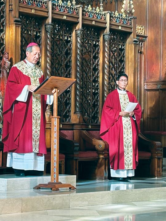 Bishop Oscar A. Solis is shown celebrating Mass in the Cathedral of the Madeleine on Sept. 14 with his younger brother as concelebrant. Father Ronald Solis, a priest of the prelature in Hong Kong, was in Utah for a visit.
