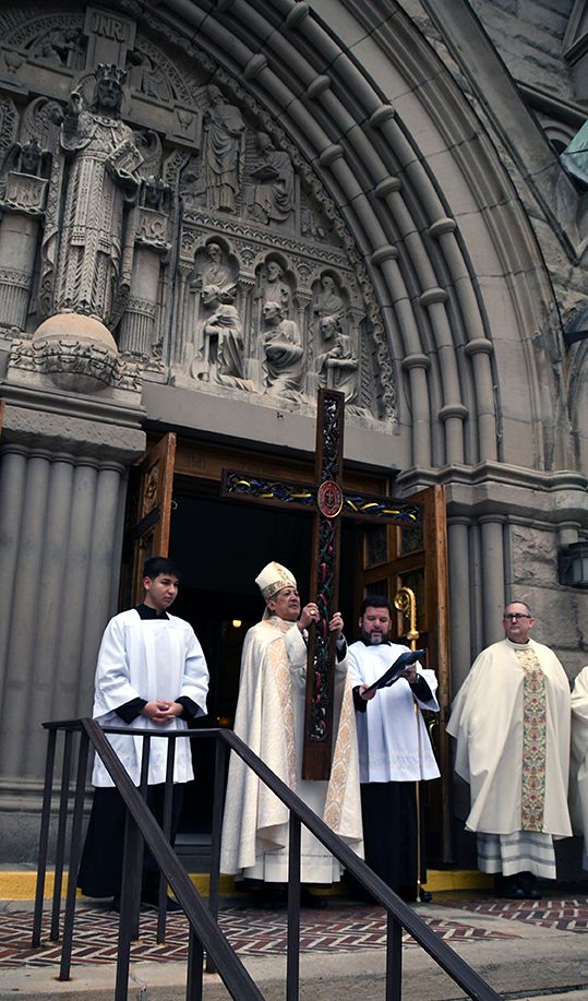 As part of the celebration for the Opening of the Jubilee Year on Dec. 29, Bishop Oscar A. Solis stands at the threshold of the Cathedral of the Madeleine and raises the cross that had been carried in the procession and invites congregants to venerate it.