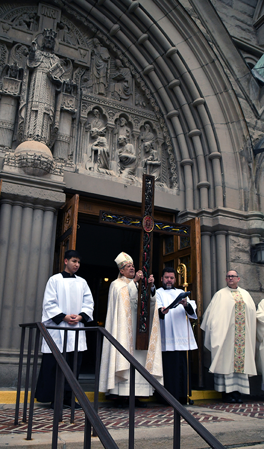 At the end of the reading, participants processed from the courtyard and around to the front entrance of the cathedral. They were led by an altar server carrying a thurifer with smoking incense, a cross embedded with a relic of the True Cross, other altar servers carrying candles, the choir, the deacon with the Gospel Book, Bishop Solis and other ministers, and members of the congregation.