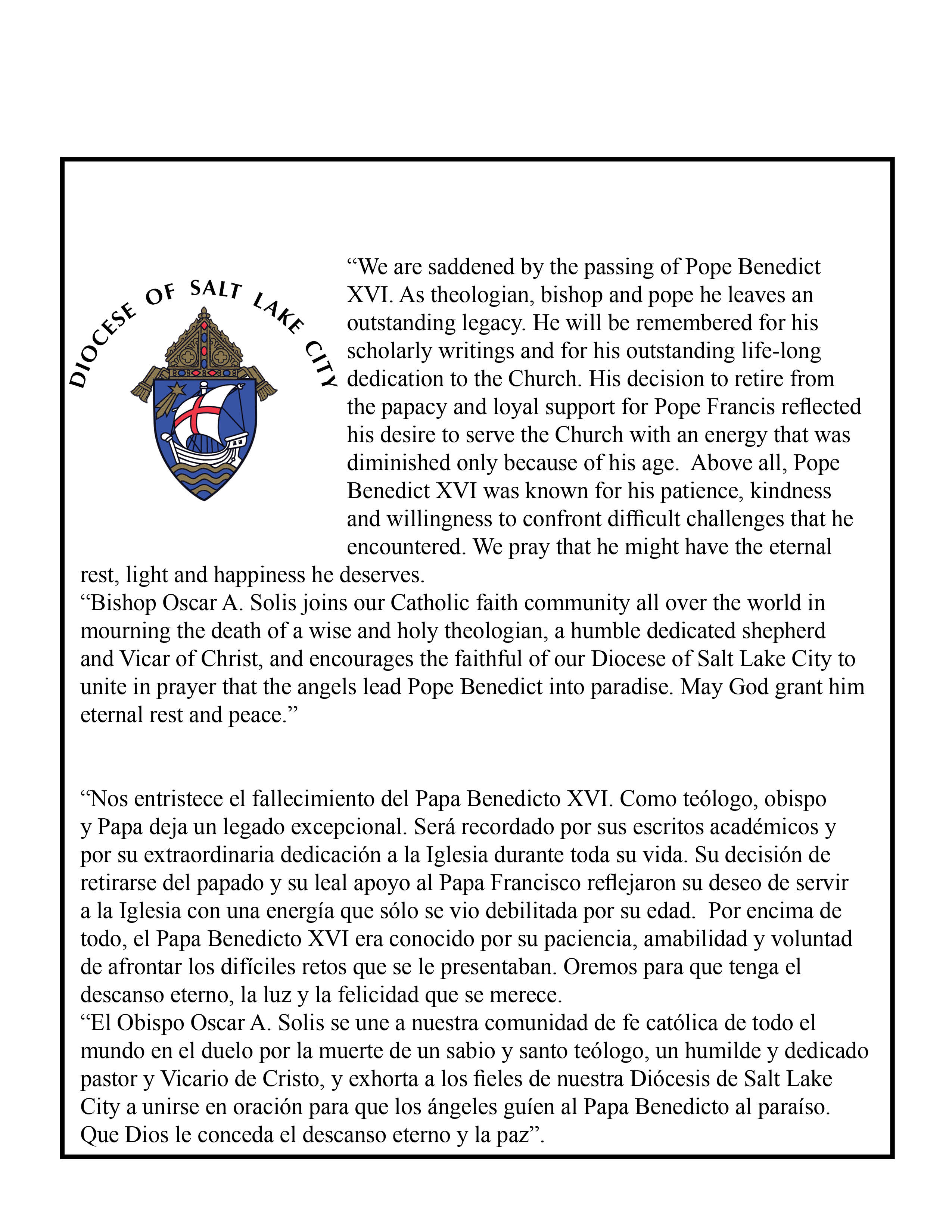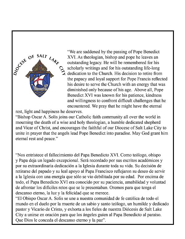 “Bishop Oscar A. Solis joins our Catholic faith community all over the world in mourning the death of a wise and holy theologian, a humble dedicated shepherd and Vicar of Christ, and encourages the faithful of our Diocese of Salt Lake City to unite in prayer that the angels lead Pope Benedict into paradise. May God grant him eternal rest and peace.”