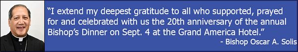 I extend my deepest gratitude to all who supported, prayed for and celebrated with us the 20th anniversary of the annual Bishop’s Dinner on Sept. 4 at the Grand America Hotel. We were honored by the presence of His Eminence Robert Cardinal McElroy, Bishop of the Diocese of San Diego, as this year’s guest speaker, and the almost 600 people who attended.