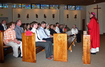 BOUNTIFUL — "I thank you for taking this important step and we welcome you fully into the church," said Bishop John Wester of the Diocese of Salt Lake City to the eighth-graders at St. Olaf Parish March 22. "This is my first confirmation in the diocese, so I will remember you all very well," said Bishop Wester. "I remember the first confirmation I did in September of 1998, so you will all be very special to me. "Usually now I would welcome all of you, but since I am new, you are all welcoming me," said Bishop Wester. "I thank you for your warm welcome." Bishop Wester said he would like to see the confirmandi throughout the diocese take away from their experience a real sense that they are fully initiated into the church now. They are fully participating members and that with the gifts of the Holy Spirit they can use those gifts to serve the church and the wider community. He would like to see them draw closer to Christ and be instruments of unity in what can be a very fragmented world. In his meeting with the confirmandi before Mass, Bishop Wester told them confirmation is a sacrament of initiation into adulthood. He said the Holy Spirit is constantly bringing us together. "Christ came to teach us to be one, and the Holy Spirit enables us to do that," he said. "The Holy Spirit is a gift." Bishop Wester quizzed the confirmandi about the seven gifts of the spirit and asked them to name the gifts. One-by-one they said wisdom, understanding, courage, knowledge, fear of God, piety, and fortitude. He gave the class an example of how he could get angry and shake his fist at someone who cut in front of him in rush-hour traffic, which could lead to a fight, or, he could use the Spirit’s gift of understanding, and let the situation go peacefully. In his homily, Bishop Wester asked the confirmandi how someone their age could use one of the gifts of the Holy Spirit to bring about greater unity in their lives either at home, school, or in their parish. He brought up the example of a how the confirmandi would react to a friend being criticized. Sara Calicchia said it would take courage to stand up for your friend. Bishop Wester then asked them to name some of the fears they may have. When no one answered, he said public speaking seems to be one of them. He said the fear of death and the fear of failure are some examples. "The common thread in all of our fears is being isolated, being alone, or being forgotten," said Bishop Wester. "In death we are separated from our loved ones and left behind. In public speaking, we are singled out and somehow separated. "We human beings have it deep within us that we want to be united," said Bishop Wester. "At your age, you know about peer pressure, and how it would be to show up at a party or an event and be completely dressed inappropriately, and be singled out." Bishop Wester said we are created in the image of God and we cannot speak about that without speaking of the Father, Son, and Holy Spirit. "When we talk about the Trinity, we talk about the unity of persons," said Bishop Wester. "God by his very nature is unity. Three persons, but one God. Jesus came to us so we might be once again made one with God. We lost that union through original sin, and so Jesus came to restore the union we lost. Ultimately Jesus died on the cross so that we could be one with God forever. Jesus conquered sin and death. Not even sin, death, or any fear can separate us from the love of God." Alexandra Welninski said being confirmed was a great experience and she liked learning about the seven gifts of the Holy Spirit. Ian Laverty said now that he is confirmed, he feels closer to God. Sara Calicchia said being confirmed means the Holy Spirit will be with her throughout her life to help lead her.