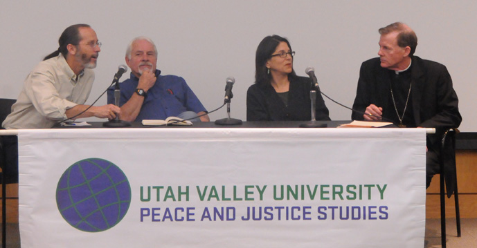 OREM — The Most Rev. John C. Wester, Bishop of Salt Lake City, joined three other experts on immigration in a panel discussion March 29 at Utah Valley University as part of the sixth annual J. Bonner Ritchie Dialogue on Peace and Justice. Bishop Wester is the immediate past chairman of the U.S. Conference of Catholic Bishops’ Committee on Migration and Refugee Services. Prior to participating in the panel, he gave a presentation on the Catholic perspective on migration, stressing that Scripture and Church teachings give a moral imperative to help strangers in need. "We see this as a moral issue," he said. "It involves human beings, not just economics." His presentation and the panel were part of the three-day Borders: Global and Local, Problems and Possibilities event sponsored by the university’s Peace and Justice Studies Department. Other presenters included Mark Alvarez, a Utah attorney and writer on immigration; Charles Bowden, a nationally syndicated journalist and author; and Olivia Ruiz, a cultural anthropologist whose research focuses on immigration along Mexico’s borders. Ruiz was among those on the March 29 panel. Other participants were Lynn England, a lecturer in history and political science at Utah Valley University; and Russell Askren, a UVU adjunct professor. The current immigration system is broken, "it’s hurting people, and that’s not acceptable," Bishop Wester said. "Therefore, we have to reform the system." The United States needs an immigration system that will allow it to control its borders, which it has the right and the responsibility to do, but the system also must allow people to come and go more freely and not die in the desert trying to improve their lives, the bishop said. Despite the risks of crossing the border illegally, many people do so because they feel it’s the only way they can get a better life for themselves and their families, England said. He added that, for an average person in Mexico, there is a 12-year wait for their application to be processed, and there is no guarantee a visa would be granted. "So there is very strong motivation" to come illegally, because it’s quicker, he said. "We have a responsibility as human beings to do something about that suffering," Ruiz said. "We have to address this in a responsible way. It’s not going to go away. " One cost that the Catholic Diocese of Salt Lake City has incurred because of the current immigration law is that a seminarian who had come to this country illegally as a child recently was sent to Mexico and won’t be able to return for at least three and quite probably seven years, Bishop Wester said. The mood in the United States right now is hostile to most immigrants, the panelists agreed, so "you have to focus on what you can actually accomplish," Askren said. Because politics is a process and a dialog, working toward small goals, rather than sweeping changes, is acceptable, Askren said. "To the extent that we’ve made it better for some people in particular circumstances, we’ve done a good thing." Ruiz suggested that rather than approaching the matter as a immigration issue, advocates could approach it as a family issue or a women’s issue. "You can work to help people … through those kinds of paths as opposed to trying to address immigration laws or immigration reform head on," she said. Even if immigration reform occurs in the United States, it won’t help if the economic issues behind immigration aren’t addressed, Bishop Wester said. "Many times immigrants are looked at as commodity," he said. "Until we have the political will and the drive to look at how we treat human beings and look at those economic issues…it frankly looks bleak."