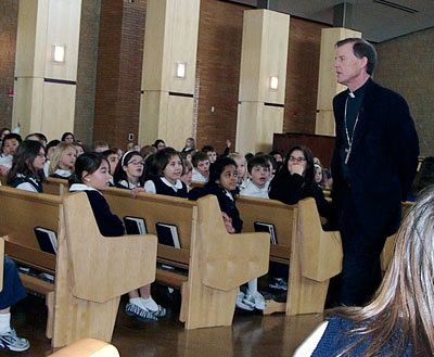 The Most Reverend John Charles Wester, Bishop of the Diocese of Salt Lake City, visited the classrooms of St. John the Baptist Catholic Elementary School February 27, followed by a question/answer session in the church and a luncheon with both the elementary and middle school faculty. During the question/answer session, the students asked many questions and learned things like: his favorite color is blue and his favorite hobbies are golf, hiking, playing the piano, and watching baseball. His approach to being a Bishop is that of a symphony director, bringing our community together and making "beautiful music." When asked by a student "Why did you decide to devote your life to God?" he answered, "In sixth grade I had some thoughts about becoming a priest and it later became clear that it was the right path to take. I now feel very blessed that I am doing something that is passionate to me. Many people have things they are passionate about, but have to put them off until they get off work, and work is just "punching a clock." I’m able to spend my day doing what I’m passionate about - God’s work." Principal Terry Lane was pleased that the Bishop could take time out of his busy schedule to visit the students. "It was a special day for our students, they were able to visit with Bishop Wester and ask him questions about his life and what being our bishop means to him. They were very excited to have him visit our school and spend time with them."