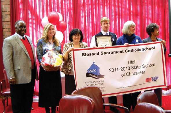 Courtesy of Blessed Sacrament Catholic School SANDY — Blessed Sacrament Catholic School was named a 2011 Utah State School of Character (SSOC). The award was presented at a banquet on April 6 at the University of Utah by representatives from the Eunice Kennedy Shriver National Center for Community of Caring, housed at the U of U. Sponsored by the Community of Caring and the Character Education Partnership (CEP), the SSOC awards program recognizes schools for their accomplishments in what is called "character education," based on 11 core values determined by the CEP. These principles include regular assessment of the learning environment, providing a challenging curriculum that aims at helping all types of students, working with families of students and the community to build students’ character, maintaining a school staff that adheres to the same ethical standards expected of students, being proactive in building students’ character and helping to build students’ self-motivation. According to Penny Keith, program coordinator for the Community of Caring, "Blessed Sacrament has developed a model comprehensive Character Education program. Their Holocaust unit, art project and Alzheimer’s Buddy project all reflect a commitment from everyone associated with Blessed Sacrament-students, staff and parents alike-toward an inclusionary atmosphere." The term inclusionary typically means that an organization does not segregate students with disabilities from the rest of the school’s population. The Utah winners were chosen by a panel of reviewers who have been involved in character education and student development for many years. Blessed Sacrament Catholic School was submitted as one of the state’s nominees for the National Schools of Character award. Blessed Sacrament Catholic School was also recognized for two programs in the Innovations in Character Education for their creation of a Character Tree and their annual portfolio, "Reflections in Faith, Academics, Character." These programs have been sent to the Character Education Partnership as possible candidates for national recognition in the area of Promising Practices.