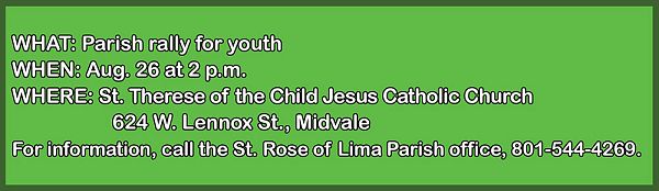 The first parish rally will be held Aug. 26 at 2 p.m. at St. Therese of the Child Jesus Catholic Church in Midvale. It will begin with a Mass, followed by a presentation about Blessed Carlo Acutis and activities and a presentation on the Real Presence. Fr. Vidal will speak on being sent out as disciples of Jesus Christ.