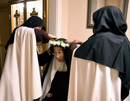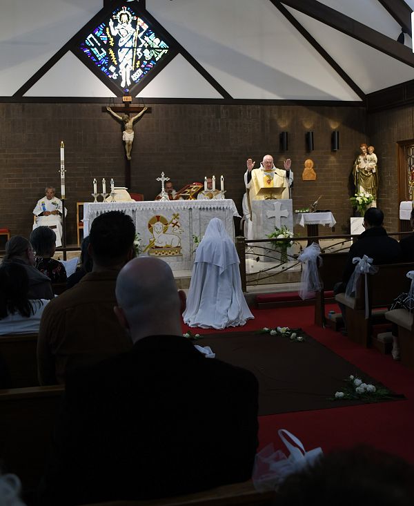 Carmelite Sister Mary Genevieve of St. John greets her family at the Sign of Peace during the Mass at which she professed solemn vows.