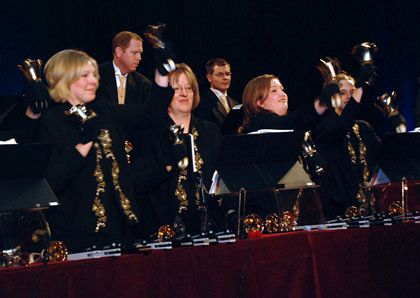 SALT LAKE CITY — The bells of the Cathedral of the Madeleine, those four deep tones that toll out in joy and in sorrow, were the focus of the fourth annual Bishop’s Dinner at the Grand America Hotel Sept. 25. The Church of Jesus Christ of Latter-day Saints’ Bells on Temple Square, under the direction of Thomas M. Waldron, rang in the dinner with 350 hand bells ranging from those weighing a few ounces to those weighing 13 lbs. The Bishop’s Dinner is a yearly fund raiser for the Cathedral of the Madeleine, providing money for the future care and maintenance of the cathedral, its rectory, and the stone convent at the corner of South Temple and C Street. Through the support of an endowment in the Catholic Foundation, donations gain interest which is used to keep up with the repairs needed on the nearly 100-year-old facility. Also honored at the dinner were members of the Michael O’Donnell family, owners of O’Donnell and Sons Mortuary, which has been in service to the Catholic community for generations. "This dinner is a new tradition, said Father Joseph M. Mayo, rector of the Cathedral of the Madeleine, "a tradition of support that has become part of our legacy of faith. It is now out turn to take over from those who came before us and assure that those who come after us will find us committed and responsible stewards of the Cathedral of the Madeleine." Bishop John C. Wester, in remarks at his first Bishop’s Dinner, said cathedrals al over the world, "Represent all that is fine about us and our faith. It stands as a monument to what is sacred in our lives." The first function of a cathedral, Bishop Wester said, is to give glory and honor to God. "In the early days people made pilgrimages to the great cathedrals and found themselves awestruck by the cathedral’s spires and stained glass windows which prompted them to say, ‘Glory to God in the highest.’ "The Cathedral of the Madeleine is more than bricks and mortar. It is a living monument to the people who go there." In a moving video provided to all guests, the history of the bells of the Cathedral of the Madeleine were traced and celebrated.