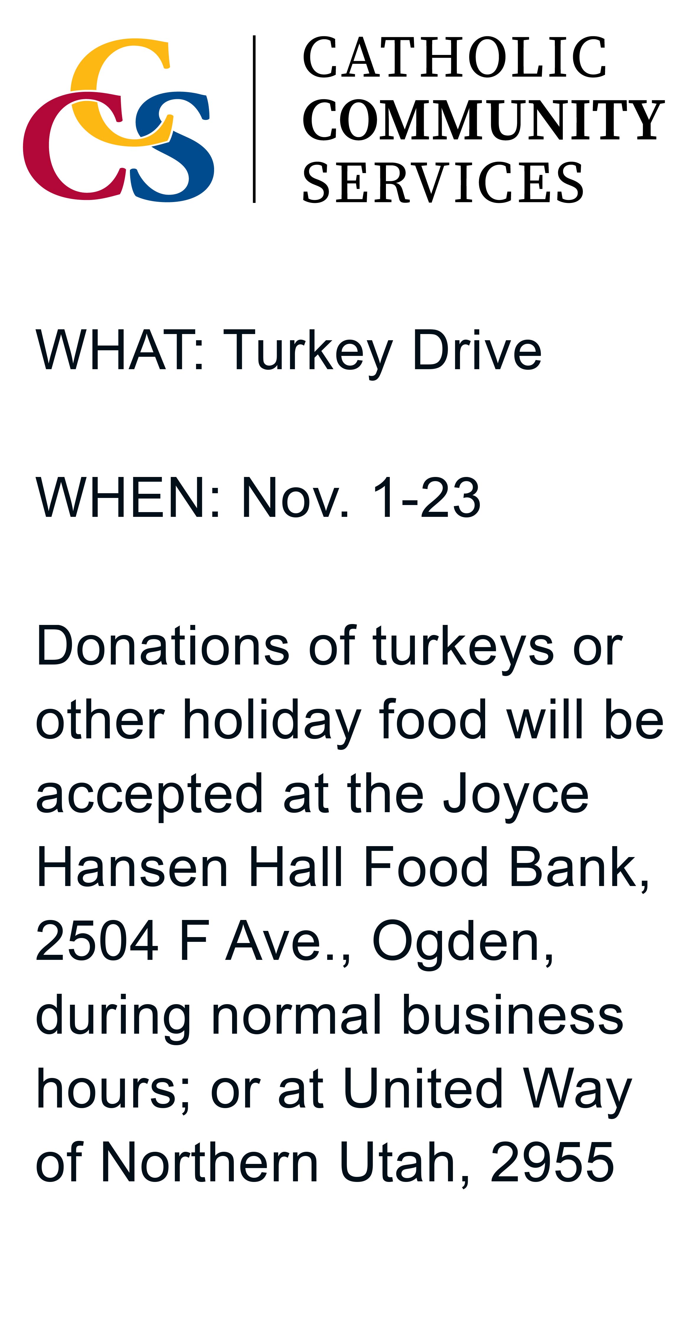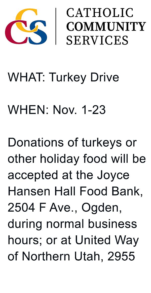 The turkey drive program runs through Nov. 23 to support the community in the Ogden area. For the drive, “CCS accepts donations of turkeys, hams and other non-perishable holiday food items to distribute to Joyce Hansen Hall food bank clients during the holiday season,” Cantrell said.
