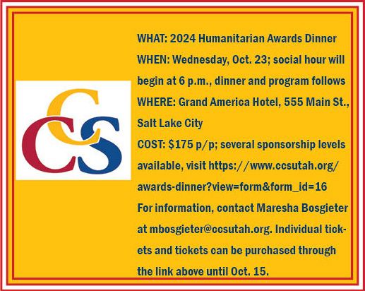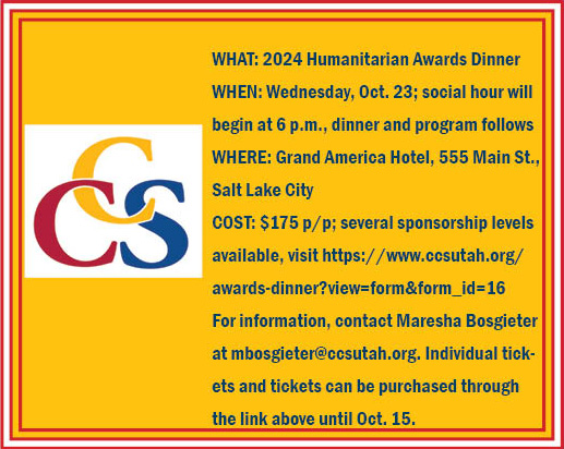 For information, contact Maresha Bosgieter at mbosgieter@ccsutah.org. Individual tickets and sponsorships available through visit https://www.ccsutah.org/awards-dinner?view=form&form_id=16 until Oct. 15.
