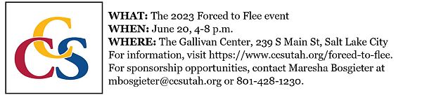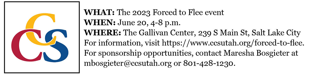 For information, visit https://www.ccsutah.org/forced-to-flee. For sponsorship opportunities, contact Maresha Bosgieter at mbosgieter@ccsutah.org or 801-428-1230.