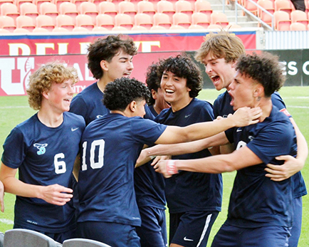 Members of the Juan Diego Catholic High School boys soccer team celebrate their 3A state victory over Morgan, 1-0, on May 12. The May 26 Intermountain Catholic will have the story.