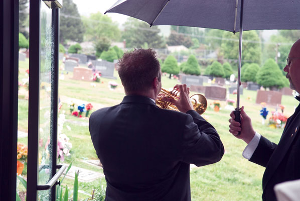 SALT LAKE CITY — Spilling out from the Risen Savior Mausoleum, Catholics gathered for Mass amid a steady rain May 26, Memorial Day, at Mount Calvary Catholic Cemetery to honor their deceased family and friends and pay tribute to the heroes who gave their lives defending their beliefs. In his homily, Bishop John C. Wester of the Diocese of Salt Lake City paraphrased a story from former Mormon Tabernacle Choir leader Craig Jessop who had spent several weeks touring with a choir from Utah State University during the Vietnam War. "While they were in the Philippines visiting a hospital, they came across a soldier who had been severely injured and had not spoken since his treatment began. As the choir began to sing hymns to the soldier, he cried and opened up to begin his healing. "We are here today to pray, to remember, to deepen the relationships that help us to live, to cry, to sing. We are here to remember Jesus is the life, who comes to us to be our life. All the themes of goodness that draw us here today find their source in the one theme which is Jesus. "Jesus conquered sin and death through the resurrection. He wants us to be one with him. We must always remember that not even death can separate us from Jesus Christ. "Jesus rises from the dead, and all of us will rise with him. This is what we celebrate," Bishop Wester said. He continued, "We know Christ in our hope. We are one with our beloved through our own action of this Eucharist. We remember we are on sacred ground, a waiting place where we capture all our memories and where Christ will come, and the trumpet will sound. In this time of waiting, we do our best to deepen our relationship with our loved ones. "We are all called to relationship with each other and with Christ," he said. Although the annual Memorial Day Mass at Mount Calvary Catholic Cemetery is usually celebrated at the altar centrally located among the graves of bishops, priests, deacons, and religious brothers and sisters, and the faithful departed of the Diocese of Salt Lake City buried at the cemetery, due to rain the Mass was moved to the Risen Savior Mausoleum for the second time since its construction, said Deacon Silvio Mayo, Chancellor of the Diocese of Salt Lake City. The collection at Mass went toward the work of Mount Calvary Catholic Cemetery. In a Mount Calvary first, Jason and George Starks of Starks Funeral Parlor provided refreshments and umbrellas to those gathered at the cemetery.