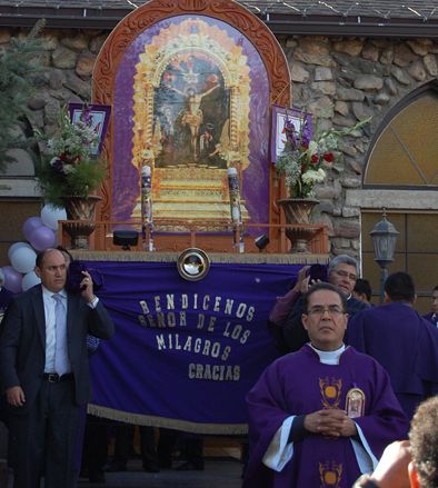 MAGNA — On Oct. 28 at our Lady of Lourdes Parish in Magna, hundreds of Peruvian Catholics gathered to celebrate the Lord of Miracles (in Spanish, El Señor de los Milagros de Nazarenas), which is a painted image of Jesus Christ that is venerated in Lima, Peru. This celebration is the main Catholic festivity in Peru and one of the biggest processions around the world. The name ‘Lord of the Miracles’ originated after a massive earthquake in Lima in the 18th century, which destroyed most of the city but left the mural standing. "For the first time ever the diocese is participating in the organization and in the celebration," said Fernando Silva, a member of the ‘Hermandad De El Señor de los Milagros,’ a group devoted to the Lord of Miracles. Before this year this celebration in Utah was tied to a regular Mass, but "this year the diocese gave us the opportunity to celebrate a Mass especially for our Lord of Miracles," said Silva. "Everyone here has arrived to celebrate him." Among those at the celebration was David Utrilla, Honorary Consul of Peru. "This celebration is not only a religious celebration, it is a cultural celebration," Utrilla said. "It is something that all Peru celebrates. I am very happy that the Peruvian community can gather and have a Mass and a procession to celebrate the Lord. This is an opportunity to gather and get united for a good cause, which ultimately is to follow our Lord Jesus Christ." Men, women and children dressed in purple tunics gathered outside the church, surrounding a big carriage that carried the image of the Lord of the Miracles – a painting showing Christ enduring the pain of the crucifixion. Above the cross is the Holy Spirit and God the Father. Below and to the right of Jesus is his mother, the Virgin Mary, with her heart pierced by a metaphorical sword of sorrow. To her right, at the foot of the cross, is St. Mary Magdalene. The image was painted by a black slave in the 17th century. "All our family has been very devoted" to the Lord of Miracles, said Freddy Robles, a Hermandad member who participated in the celebration with his wife and daughter. "It’s an honor to participate in this celebration. This is a very sacred event for us. We have been believers of our Christ of Peru; it’s part of our culture and of our Catholic faith." Every October, hundreds of thousands of faithful from all races and economic backgrounds celebrate the Lord of Miracles in a religious procession through the streets of Lima. The boulevards are dressed in purple to celebrate the Lord of Miracles on Oct. 18, 19 and 28 during the annual procession through the streets of Lima. "More than 200 cities in the world celebrate this festivity and beginning this year we can say that Utah is celebrating it too," said Silva. In Utah about 350 people from West Valley City, Orem and Salt Lake City participate in the Hermandad. "It’s an honor, a great joy and a pleasure to be able to celebrate my roots and heritage here in Utah," said Piero Macu, part of the Hermandad. At the Mass, Father Javier Virgen, Our Lady of Lourdes pastor, welcomed everyone, saying that the parish was open to them. "This day Christ calls us to walk together so we welcome this celebration with great joy," said Fr. Virgen.