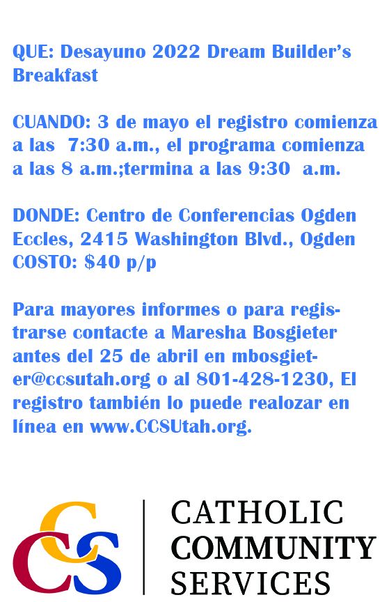 Las personas que asistan al desayuno ‘Dream Builders’ tendrán la oportunidad de aprender más sobre la misión de CCS, de las personas a las que sirven y de cómo cada uno puede ser parte de una historia de éxito. El desayuno es el único evento de recaudación de fondos para CCS del noreste de Utah, “pero debido a su generosidad y apoyo a nuestra comunidad este provee cerca del 10 por ciento de los costos operativos anuales,” dijo Bosgieter.