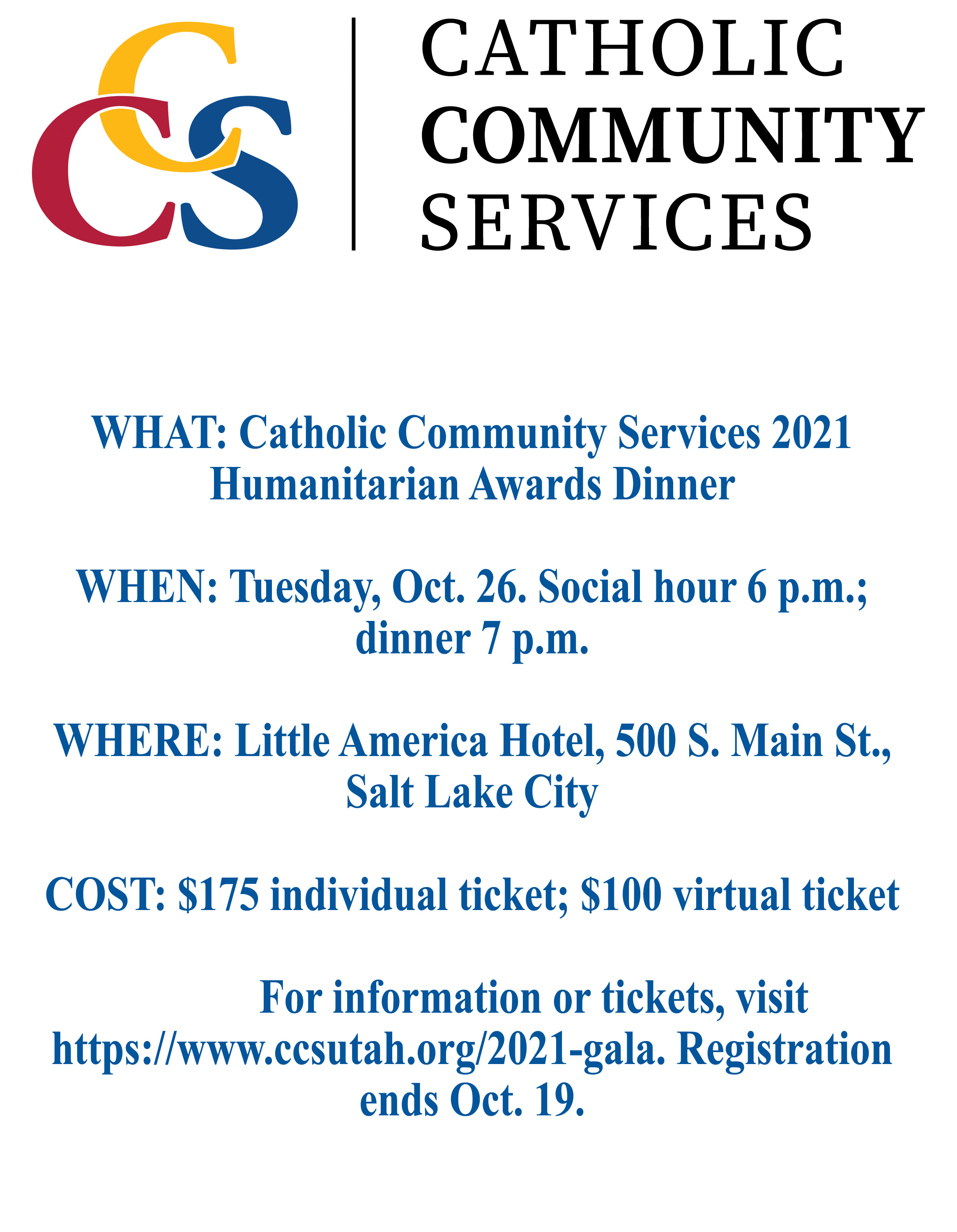 SALT LAKE CITY – Catholic Community Services of Utah will hold its 2021 Humanitarian Awards Dinner at Little America Hotel on Tuesday, Oct. 26.