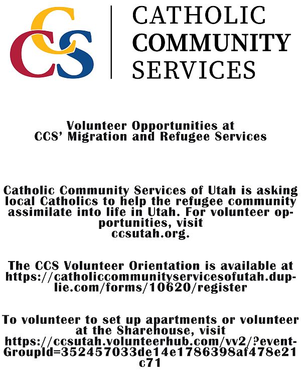 Catholic Community Services of Utah is asking local Catholics to help the refugee community assimilate into life in Utah. For volunteer opportunities, visit csutah.org.