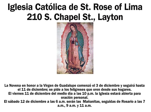 La Novena en honor a la Virgen de Guadalupe comenzó el 3 de diciembre y seguirá hasta el 11 de diciembre a las 7 p.m. a diario en la parroquia. El viernes 11 de diciembre habrá una Misa a las 9 a.m. en inglés y a las 7 p.m. en español. El sábado 12 de diciembre a las 5 a.m. serán las Mañanitas.
