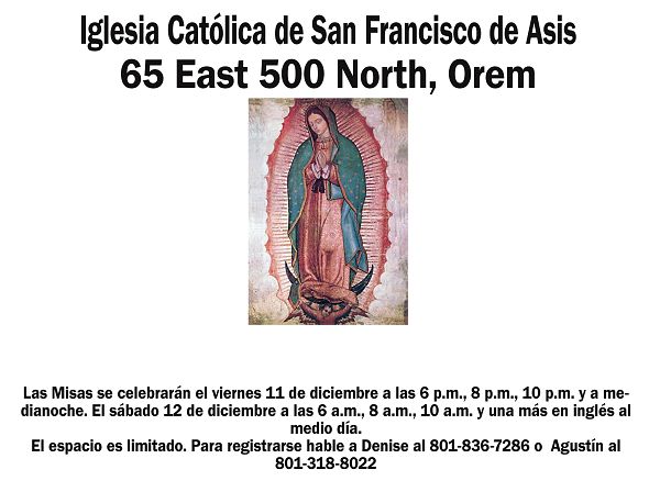 Las Misas se celebrarán el viernes 11 de diciembre a las 6 p.m., 8 p.m., 10 p.m. y a medianoche. El sábado 12 de diciembre a las 6 a.m., 8 a.m., 10 a.m. y una más en inglés al medio día. El espacio es limitado. Para registrarse hable a Denise al 801-836-7286 o Agustín al 801-318-8022
