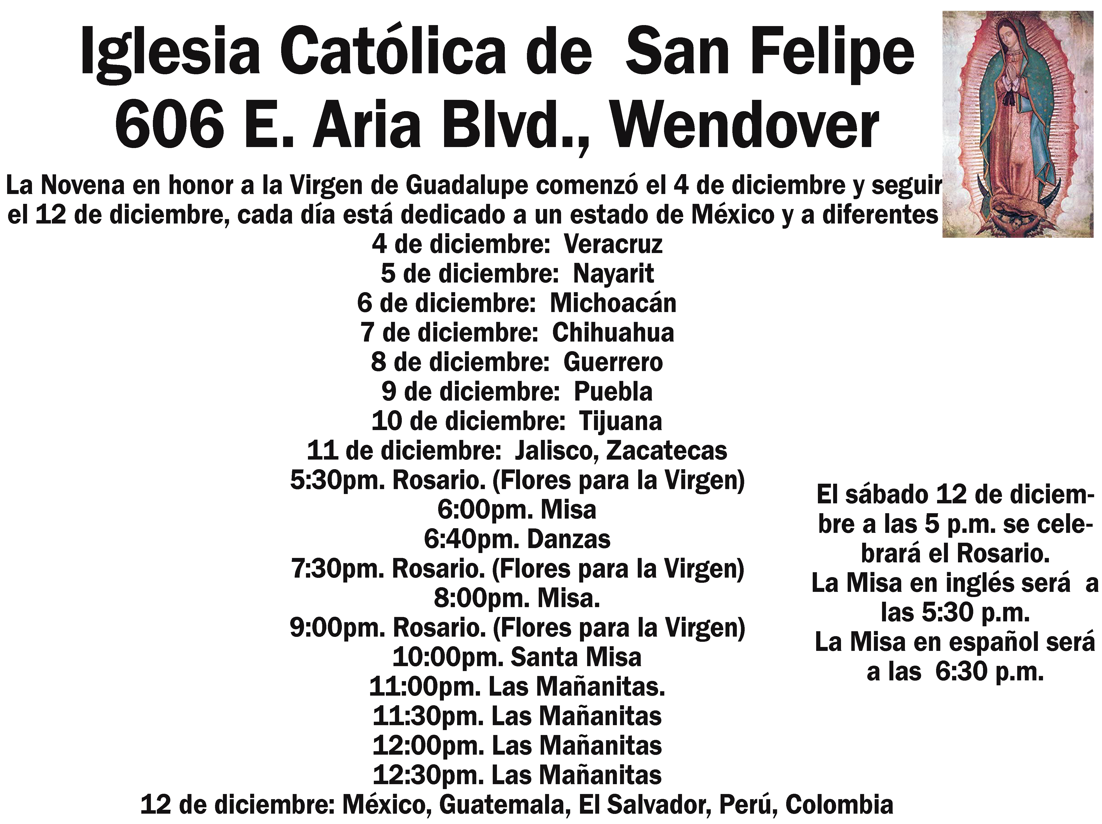 La Novena en honor a la Virgen de Guadalupe comenzó el 4 de diciembre y seguirá hasta el 12 de diciembre, cada día está dedicado a un estado de México y a diferentes países. 4 de diciembre: Veracruz 5 de diciembre: Nayarit 6 de diciembre: Michoacán 7 de diciembre: Chihuahua 8 de diciembre: Guerrero 9 de diciembre: Puebla 10 de diciembre: Tijuana 11 de diciembre: Jalisco, Zacatecas 5:30pm. Rosario. (Flores para la Virgen) 6:00pm. Misa 6:40pm. Danzas 7:30pm. Rosario. (Flores para la Virgen) 8:00pm. Misa. 9:00pm. Rosario. (Flores para la Virgen) 10:00pm. Santa Misa 11:00pm. Las Mañanitas. 11:30pm. Las Mañanitas 12:00pm. Las Mañanitas 12:30pm. Las Mañanitas 12 de diciembre: México, Guatemala, El Salvador, Perú, Colombia El sábado 12 de diciembre a las 5 p.m. se celebrará el Rosario. La Misa en inglés será a las 5:30 p.m. La Misa en español será a las 6:30 p.m.