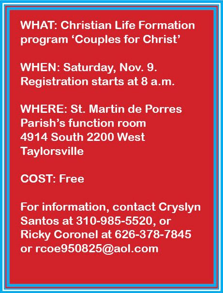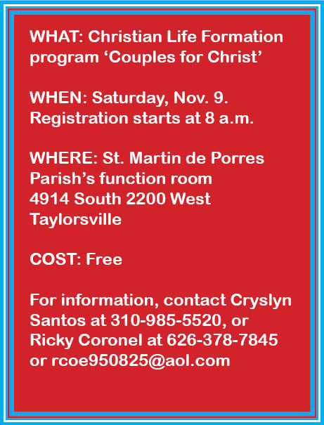 Couples for Christ will be held on Nov. 9 in St. Martin de Porres Parish’s multipurpose room, 4914 South 2200 West, Taylorsville. It will begin with registration at 8 a.m. and end with a bilingual Mass at 5 p.m.