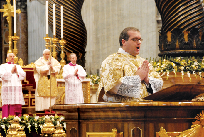 Deacon Christopher Gray, who will be ordained a priest for the Diocese of Salt Lake City in June, was the Cantor Deacon during the Christmas Mass during the Night in St. Peter’s Basilica with Pope Benedict XVI presiding. He is shown proclaiming the Gospel. Deacon Gray also set up the altar for the Mass, and met Pope Benedict afterward.