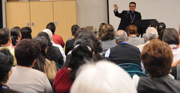 DRAPER — Más de 500 personas se dieron cita en el Centro Católico Skaggs para celebrar el Congreso Pastoral Diocesano 2012 ‘Hospitalidad: Todos Están Bienvenidos en Este Lugar’. El Reverendísimo John C. Wester, Obispo de Salt Lake City dijo que evento fue una oportunidad para orar y estudiar y una oportunidad para reflexionar sobre el llamado de Dios en nuestras vidas. Muy temprano por la mañana del sábado 22 de septiembre el congreso comenzó con una oración bilingüe en el auditorio del Centro. Más adelante las presentaciones principales realizadas por el Reverendo Les Schmidt, en inglés y por el Reverendísimo José Arturo Cepeda Escobedo, Obispo Auxiliar de Detroit en español. La presentación de Cepeda ‘Todos Están Bienvenidos en Este Lugar’ se basó en la importancia que la hospitalidad tiene, se mantiene y crece en y con la Palabra de Dios. La presentación remarcó el papel de esta Palabra en el crecimiento espiritual de los agentes pastorales en la evangelización mediante las escrituras. "Es muy importante que las personas participen en estos eventos por dos razones, primero para que nuestra comunidad de hispanos puedan entender que son parte de la comunidad eclesiástica de la Iglesia de Salt Lake City", dijo el Obispo Cepeda. El segundo motivo que el Obispo mencionó es "para experimentar un proceso de formación nuestros agentes pastorales necesitan continuamente seguir en ese proceso de formación para poder seguir llevando la buena nueva porque la buena nueva ser agentes más efectivos en nuestro ministerio con los demás." Makrina de la iglesia Católica de Santo Tomás de Aquino en Logan fue la primera vez que asistió a un congreso pastoral. "Quise venir a aprender, el tema estuvo bastante bien en todos lados que nos dan la bienvenida nos sentimos mucho mejor," dijo Makrina. "Me parece magnífico," remarcó Juan Antonio quien llegó de la misma parroquia. "Me gusta mucho lo que es la bienvenida, todos debemos de ser hospitalarios en nuestras parroquias debemos de darnos la bienvenida como hermanos." Desde Wendover de la parroquia de San Felipe llegó Blanca Galaviz, quien dijo que la presentación le había parecido excelente. "Hemos aprendido como ser hospitalarios en nuestras comunidades. Vine para prepararme mejor y para poder ser un mejor servidor en nuestras parroquias," dijo Galaviz. Además de la presentación del Obispo Cepeda, Jesús Abrego, Gabriela Archuleta, La hermana Verónica Fajardo, Maribel Villareal y María Elena Treviño Ponce, presentaron diversas sesiones con diferente temas, tales como el Ministerio Intercultural para Hispanos, La Eucaristía, los ciclos de la violencia doméstica y la ayuda para salir de estos. Durante la homilía presidida por el Reverendísimo John C. Wester, el obispo dijo que "es un buen tiempo para recor-darnos a nosotros mismos la importancia que tiene la hospitalidad en nuestra Iglesia".