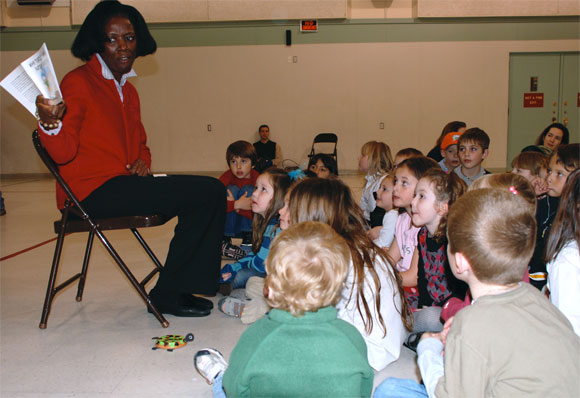 Students from kindergarten through grade three gather around Ada Chukwukeme, a native of Nigeria, while she reads from her children’s book, "Why Turtles have Patchy Shells" at St. Francis Xavier Regional School’s Family Reading Night Nov. 15. Parents and students were encouraged to share their favorite children’s books. Proceeds from the sales of her book go to support Triumph International School, located in the Plateau State of Nigeria. Triumph International School provides classes for children in day care, pre-school, and kindergarten. Their goal is to raise funds to build an entire elementary school. At right, second-grader Sophie Robertson holds her three-year-old sister, Katie, so Katie can see the pictures in the book. After the reading the children made turtles like the one on the floor at left.